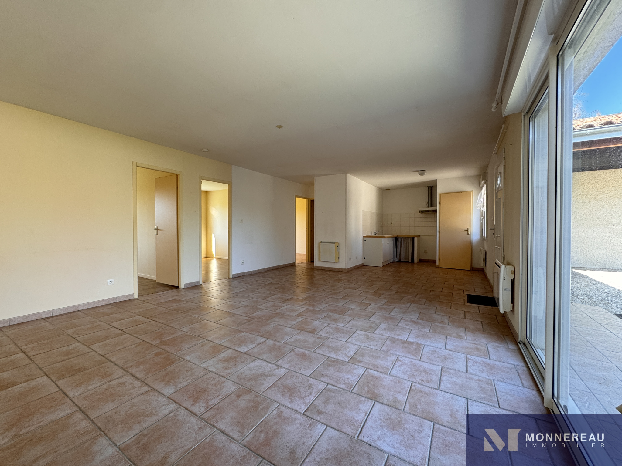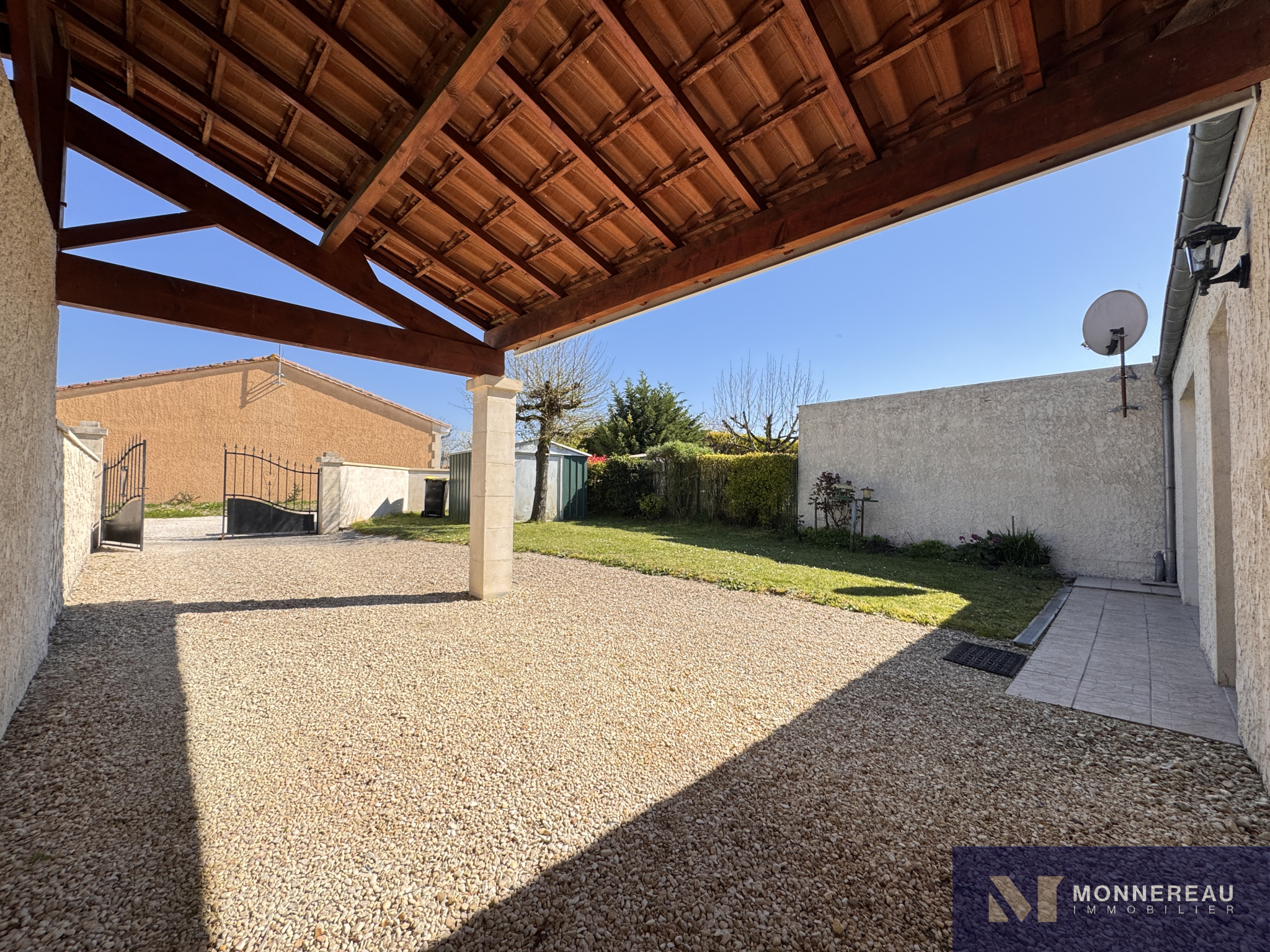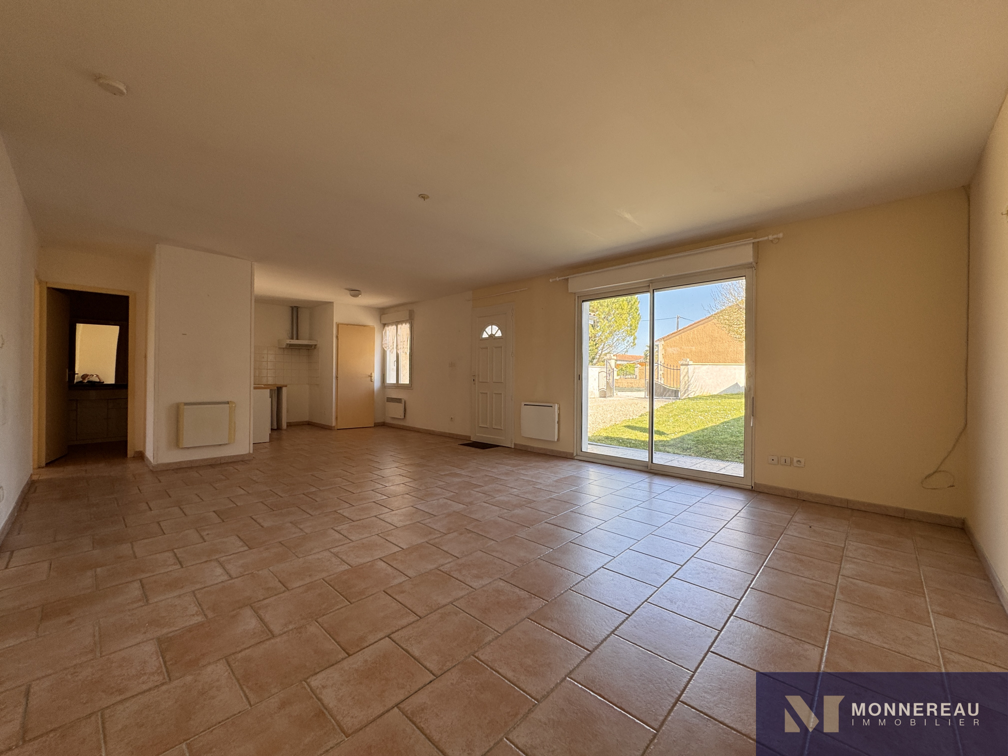 BARBEZIEUX (16) - Dans un petit hameau, au calme, maison construite en 2008 sur un terrain clos d'environ 260 m2. Elle offre environ 80 m2 habitables de plain-pied en bon état. Séjour d'environ 30 m2 avec cuisine ouverte et baie vitrée sur le jardin. Trois chambres et salle d'eau avec wc. Cellier. Tout à l'égout. Chauffage par radiateurs électriques. Possibilité d'acheter avec isolation des combles refaite et climatisation réversible neuve. Parking, carport et jardin sur l'avant. Exclusivité.