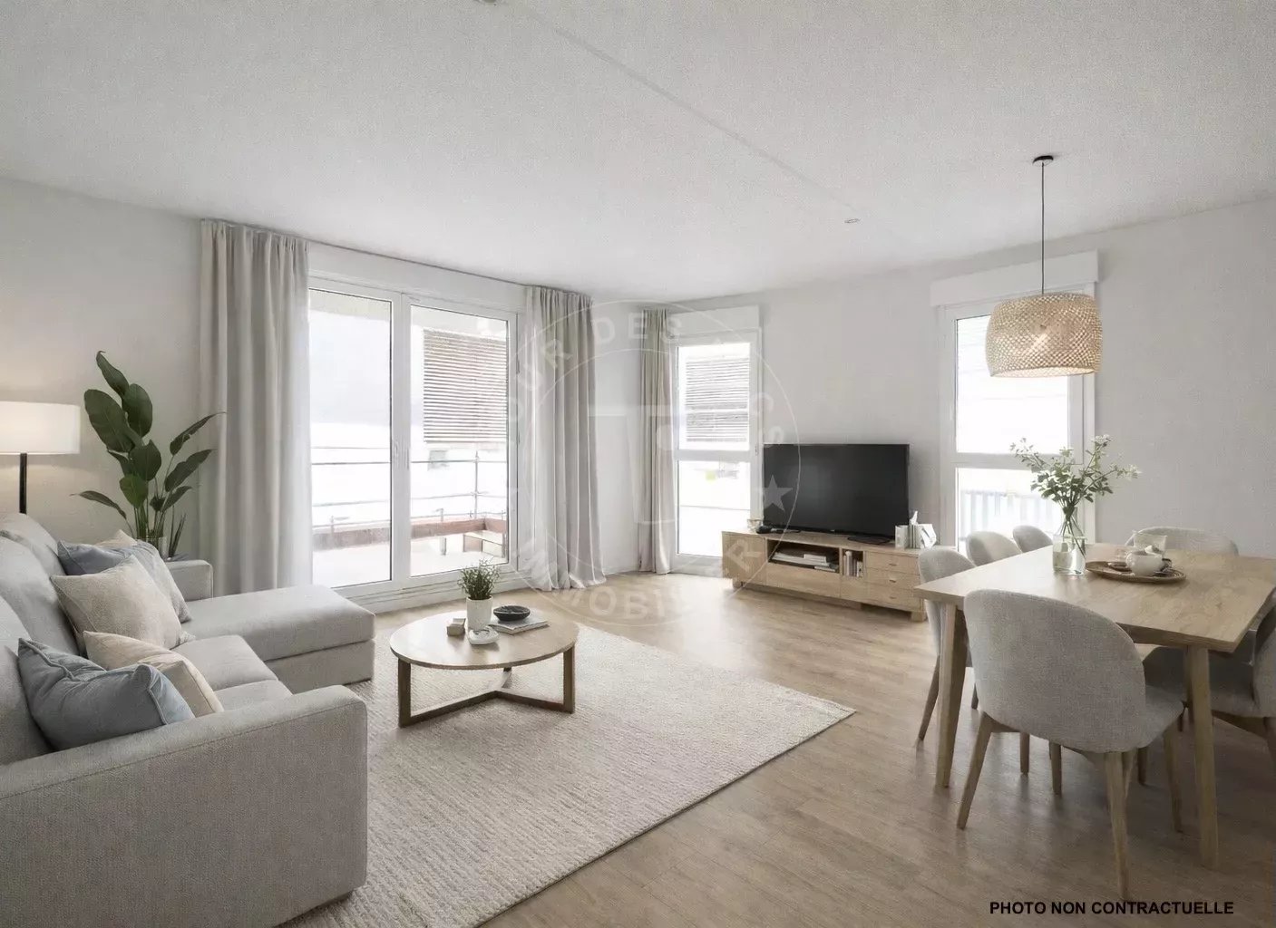 L’espace de vie développe près de 30 m² avec cuisine ouverte et s’ouvre sur deux extérieurs distincts : une terrasse et un balcon.