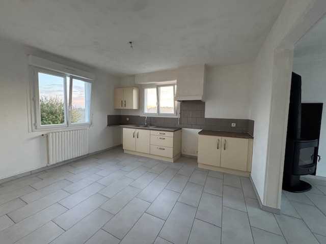 Elle se compose comme suit : sous sol total, au RDC surélévé : une belle pièce de vie lumineuse avec cuisine aménagée et un poêle à bois, deux chambres, une salle d'eau et un WC séparé.