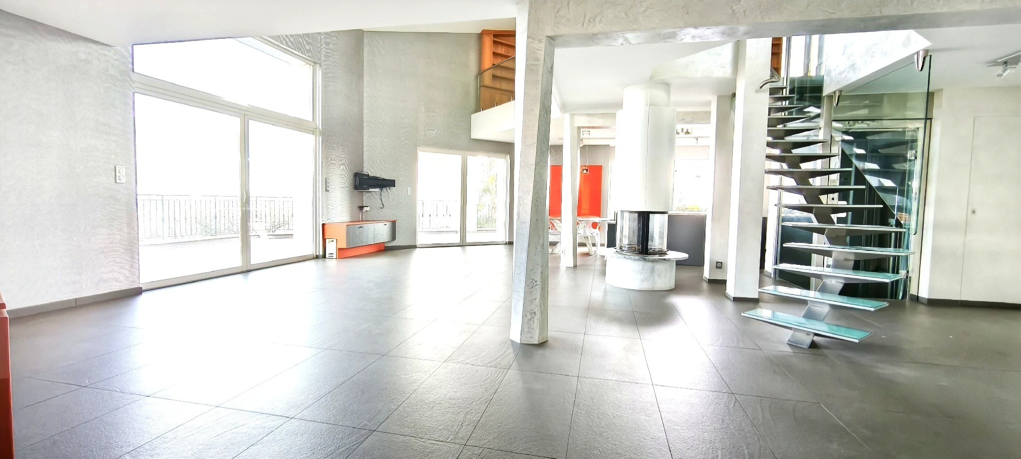 Dès l'entrée, les volumes impressionnent. Le séjour d'environ 60 m2, baigné de lumière, s'ouvre généreusement sur l'extérieur grâce à de larges baies vitrées à galandage, offrant une continuité parfaite vers la terrasse et une vue mer spectaculaire. Une cheminée centrale avec insert vient sublimer cet espace de réception raffiné.