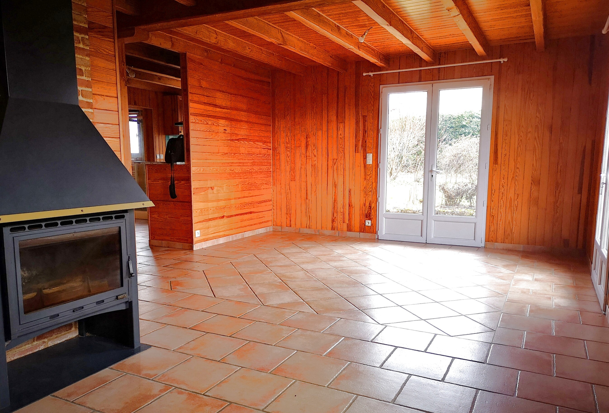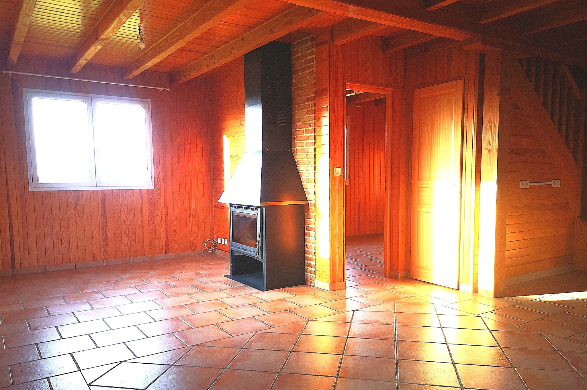 - en rez de chaussée, un séjour lumineux avec poêle à bois, une cuisine équipée attenante, une salle d'eau, un WC indépendant