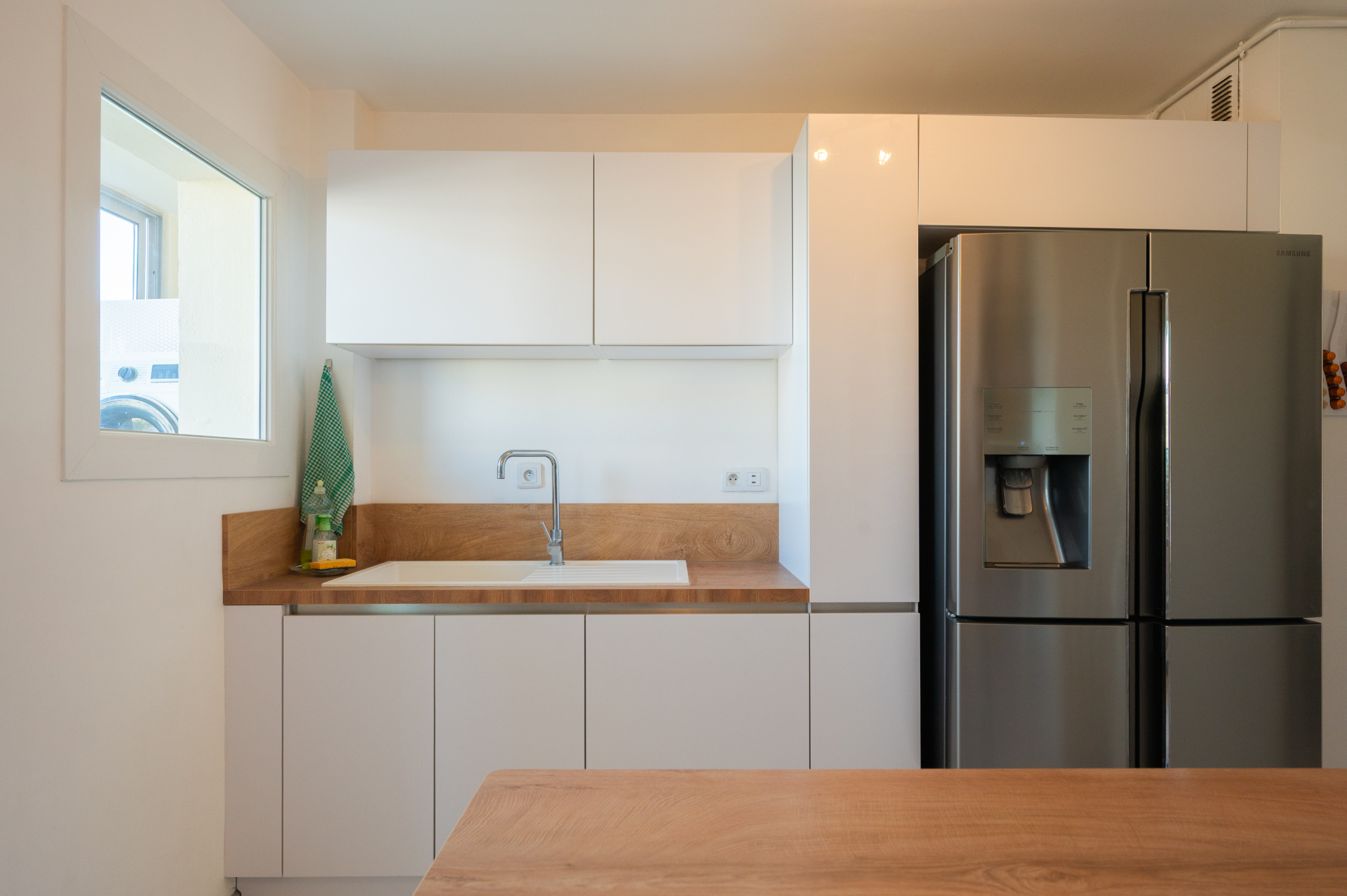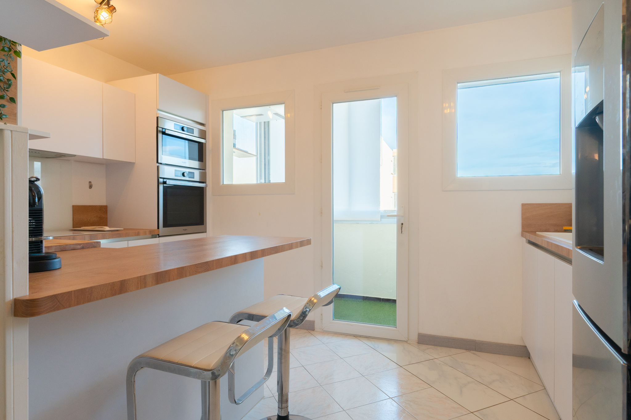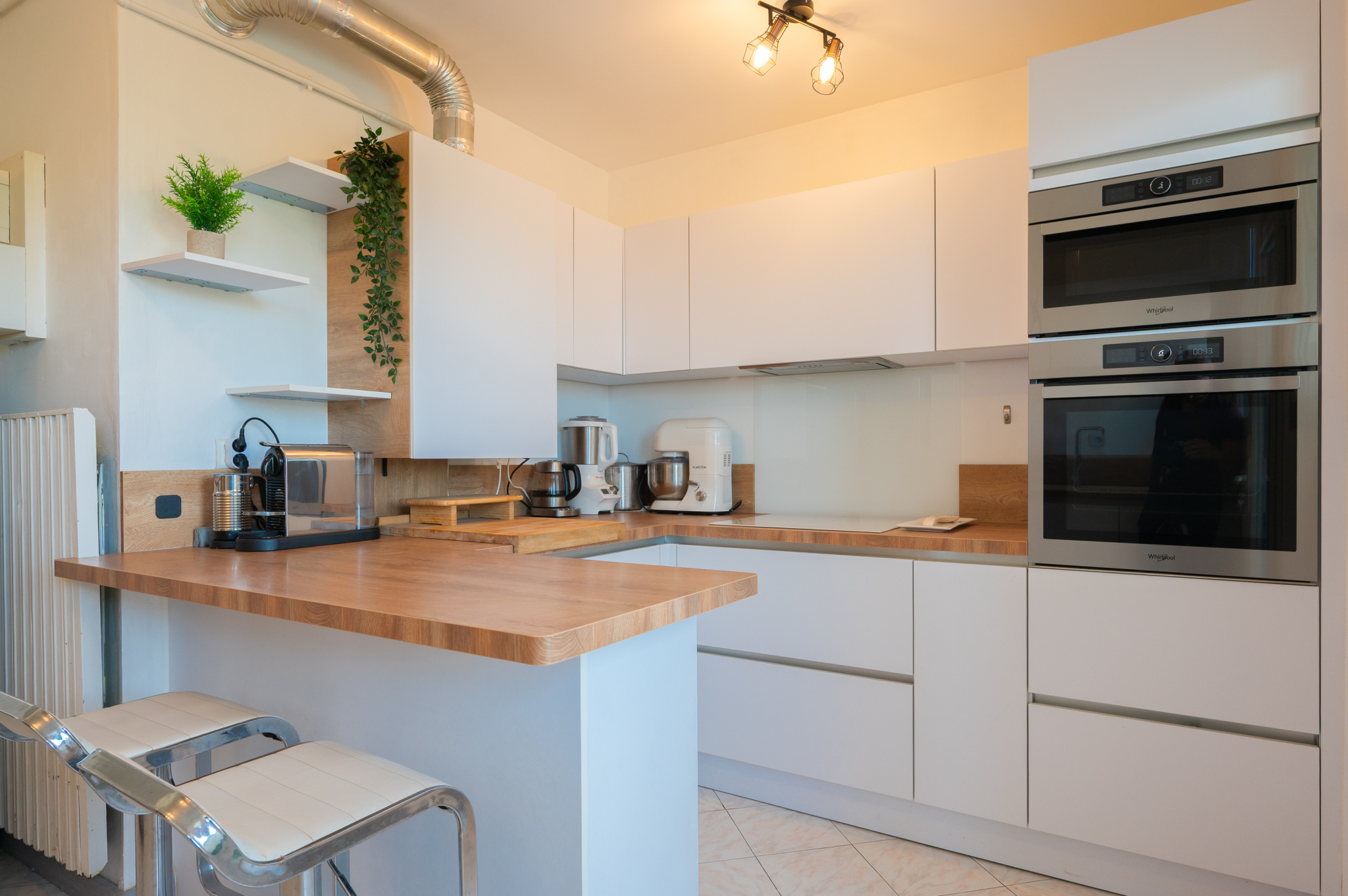 La cuisine semi-ouverte, moderne et fonctionnelle, donne accès à une loggia, parfaite pour un espace buanderie ou rangement complémentaire.