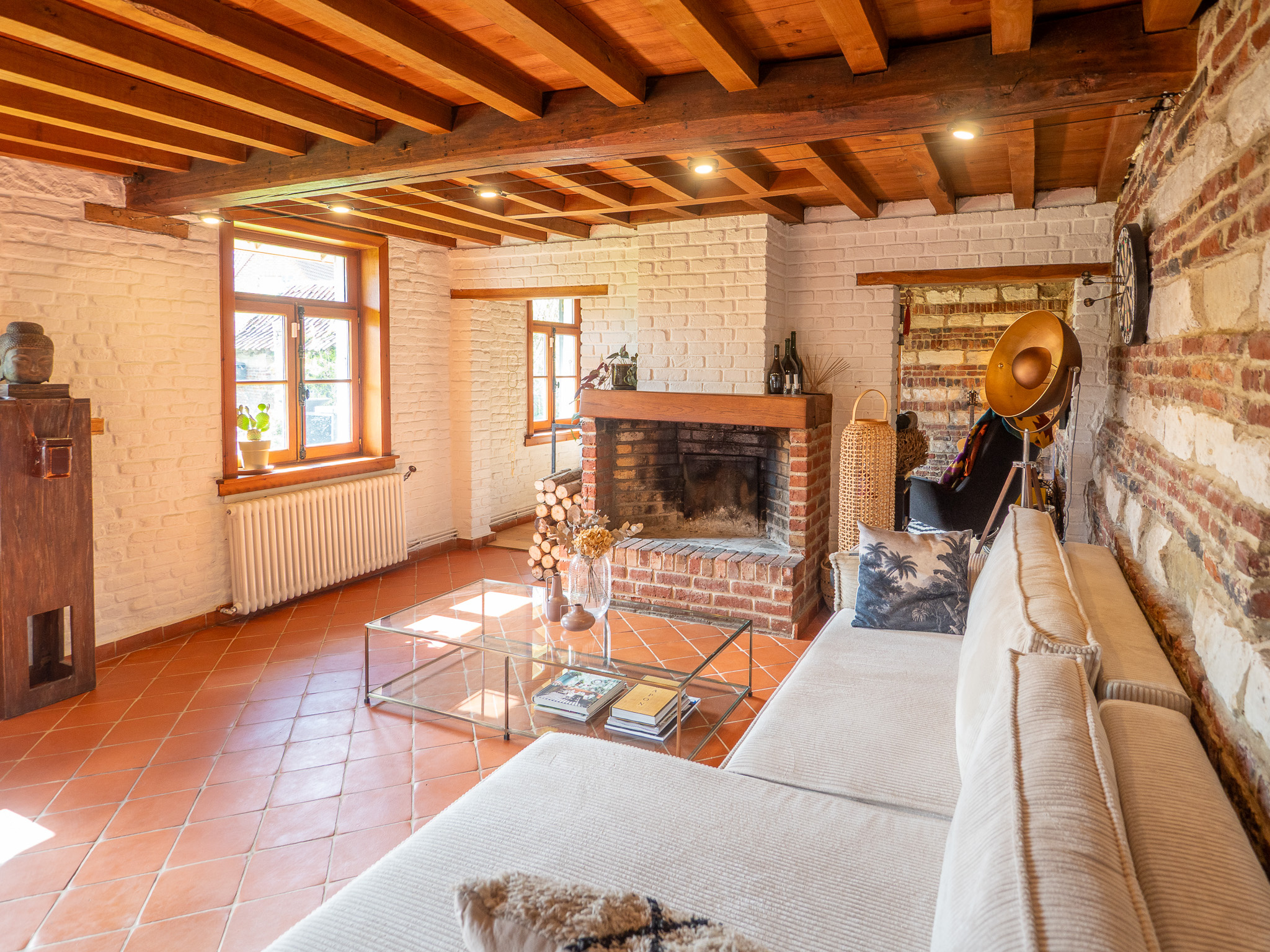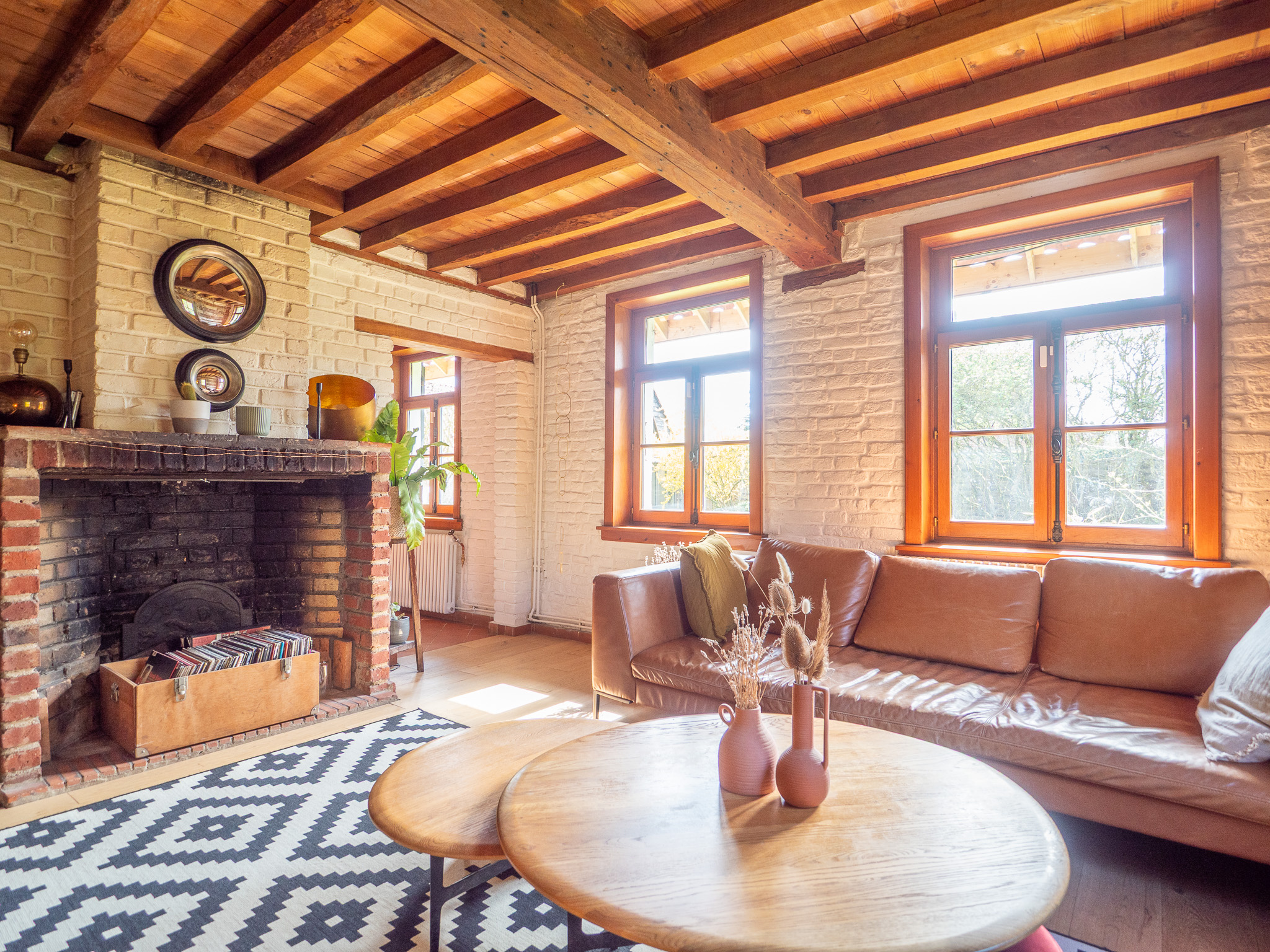 Le séjour de 55 m2 avec cheminée feu de bois (CFB), briques et poutres apparentes crée un espace chaleureux et authentique. La cuisine équipée avec des vitres d'atelier donne sur le jardin, apportant une belle luminosité.