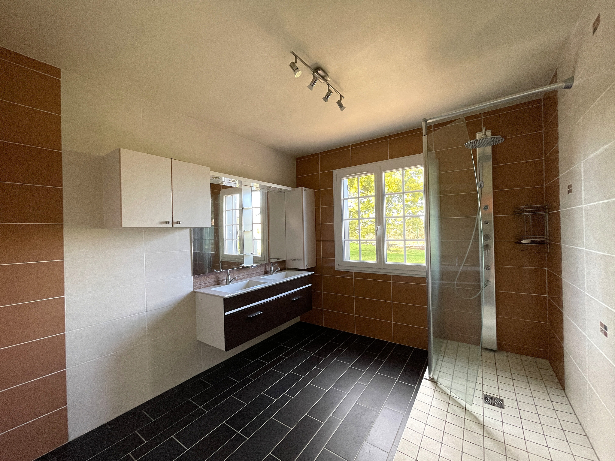 Grande véranda et terrasse exposées Ouest donnant sur un jardin au calme et sans vis-à-vis.