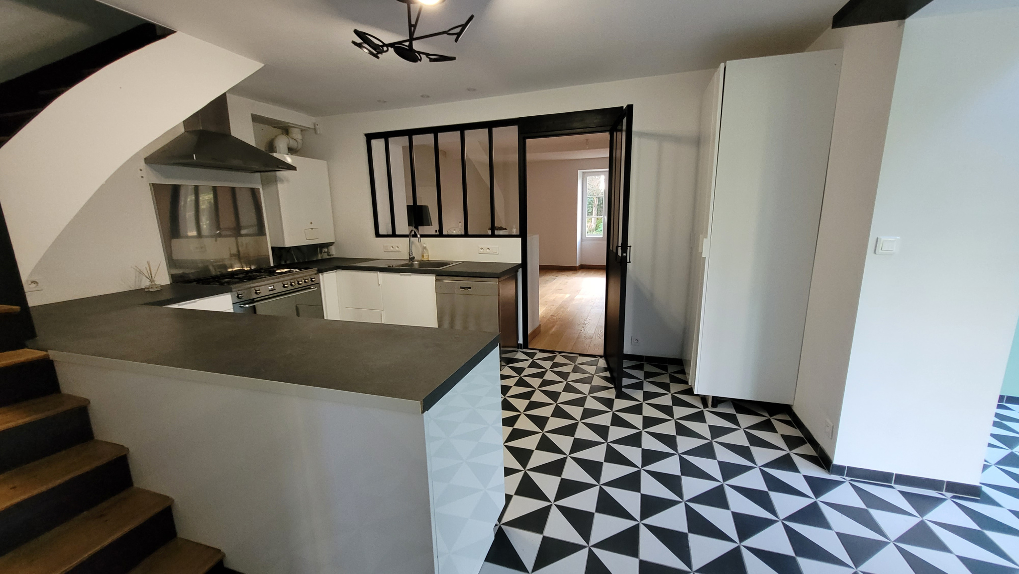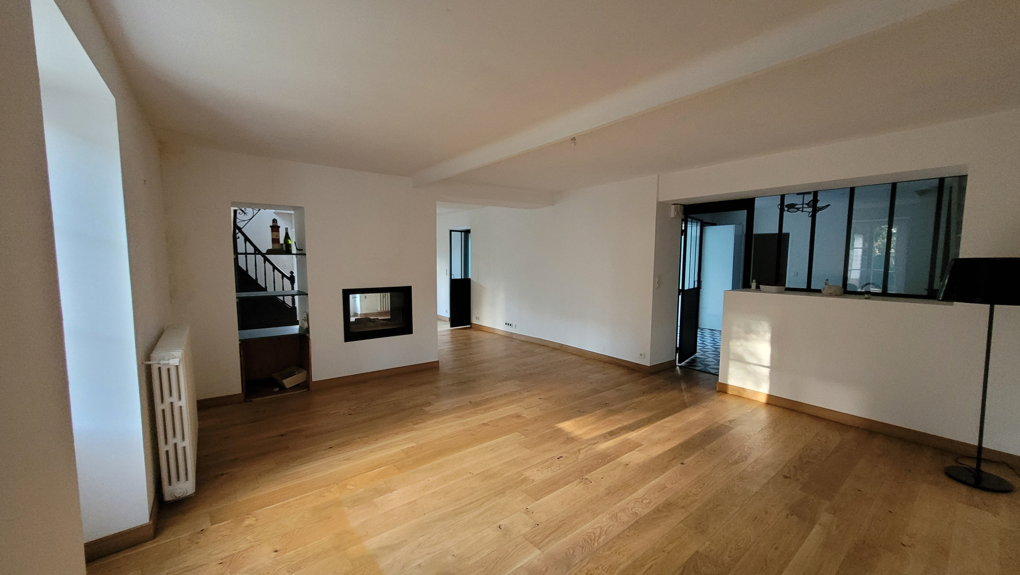Dans le prolongement, la cuisine aménagée et équipée (hotte, piano de cuisson gaz avec four électrique, lave-vaisselle) qui dessert la pièce de vie salon-séjour à double exposition, avec une cheminée traversante d'une surface de 50 M2 environ