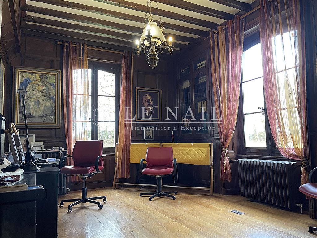 Ce niveau accueille également un bureau aux boiseries d’époque, une cuisine moderne, ainsi qu’un vaste salon d’environ 70 m² agrémenté d’une cheminée et d’un espace billard. Attenante à celui-ci, la salle à manger d’environ 50 m² est installée dans l’ancienne orangerie, baignée de lumière grâce à sa verrière.