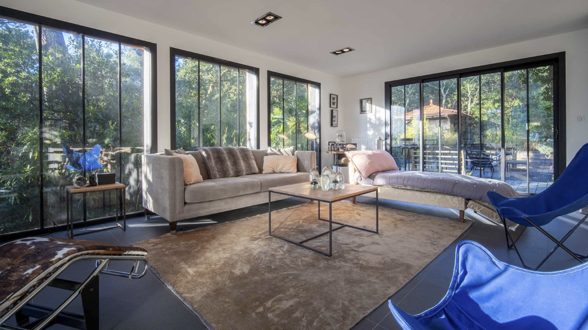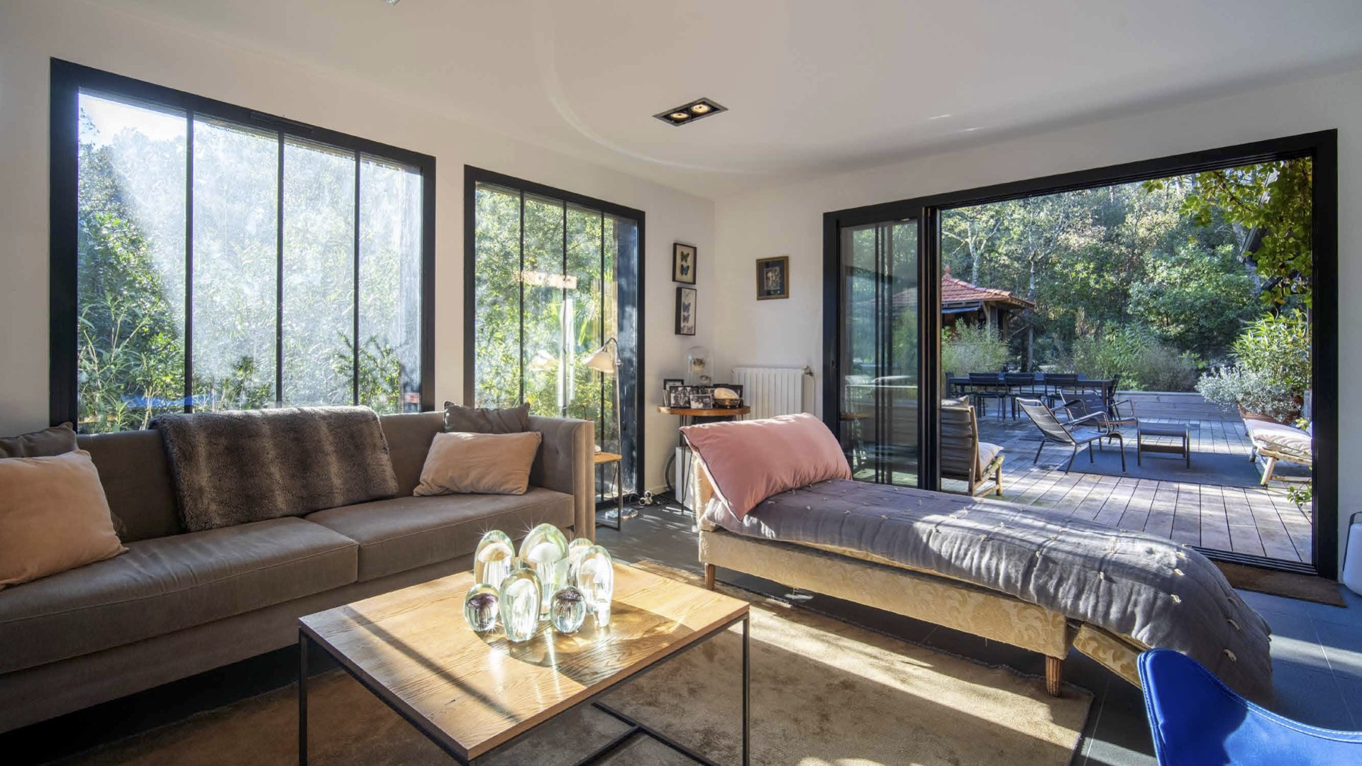 Le salon s'efface devant une immense terrasse de 60 m2 qui s'ouvre sur un jardin aux essences exotiques, parfaitement entretenu. Au coeur de cet écrin de verdure, la piscine devient le centre de la vie estivale, complétée par un cabanon abritant une cuisine d'été et deux douches extérieures pour les retours de plage.