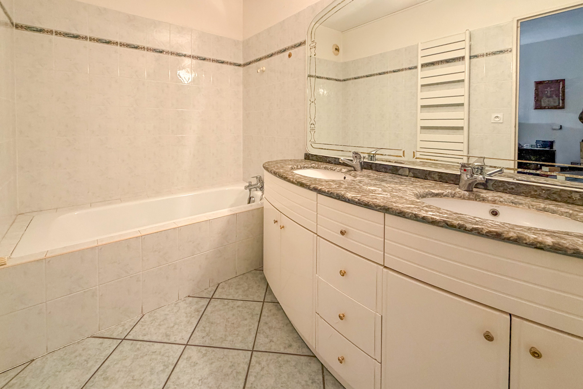 Idéalement situé en coeur du village, l'appartement se trouve dans une petite résidence sécurisée, les écoles, commerces et transports à ses pieds. Ce très beau 3 pièces de 100,50 m2 habitables comprend un vaste séjour/cuisine ouvert sur une terrasse de 36 m2 orientée au sud, une suite de 20 m2 avec salle d'eau et wc, une suite de 19 m2 avec salle de bains, une buanderie, un wc indépendant avec lave-mains et une entrée. Place de stationnement privée. Quelques rafraichissements sont à envisager. Garage et cave attenante dans la résidence sécurisée possibles.