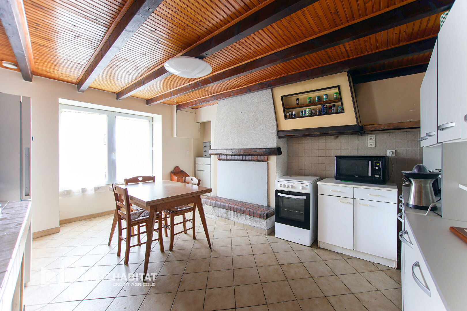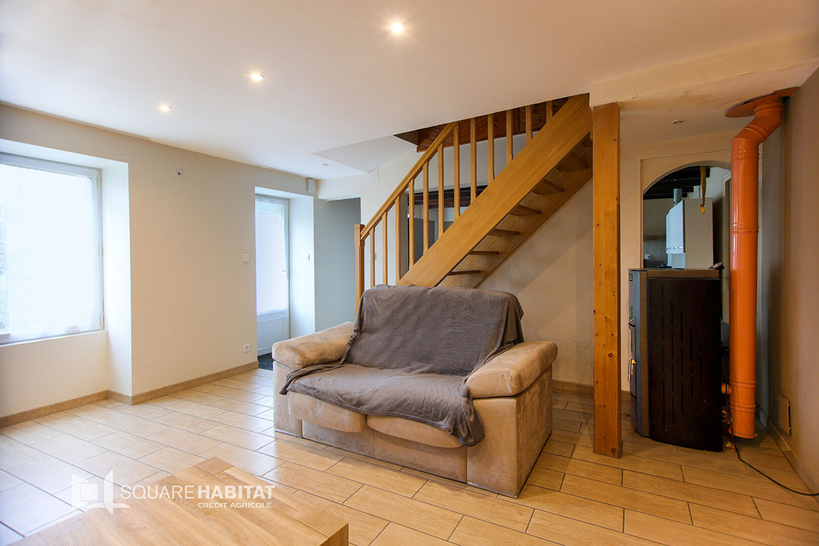 Elle se compose, au rez-de-chaussée, d'une cuisine, d'une buanderie, d'un salon séjour, d'une douche avec WC, ainsi qu'un garage. La présence du poêle ajoute une touche de confort supplémentaire, idéale pour des soirées cosy.