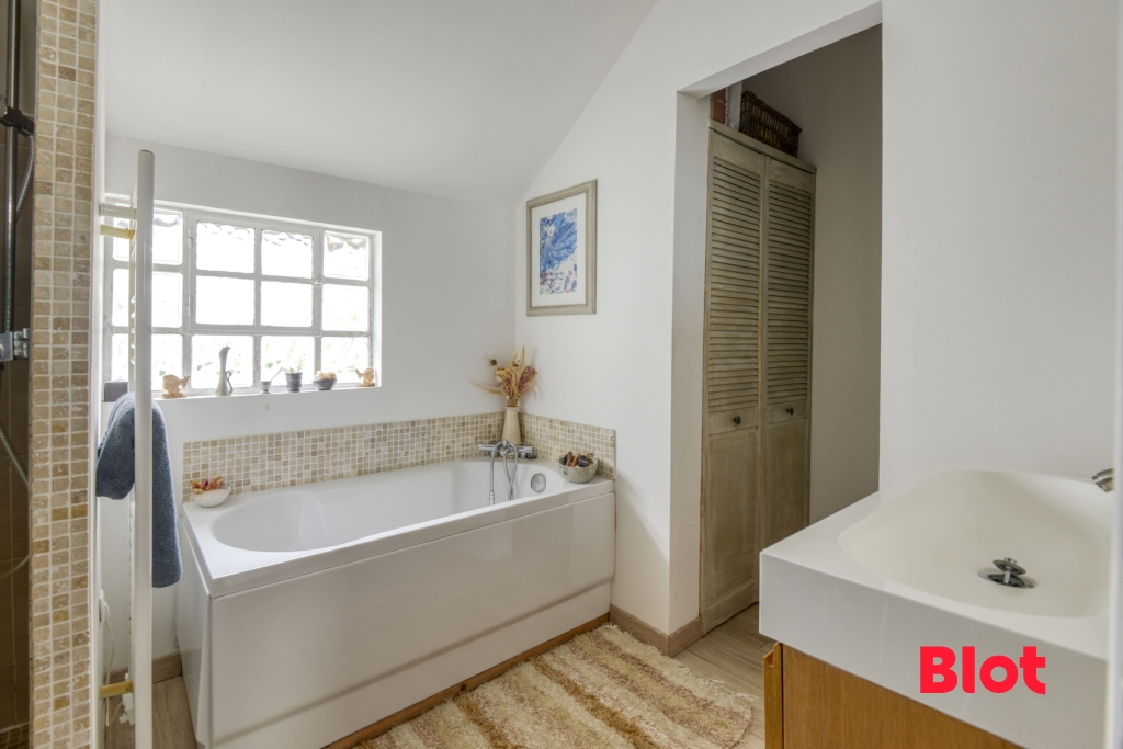 A l'étage elle dispose d'un espace bureau et de deux belles chambres avec une salle d'eau et un WC