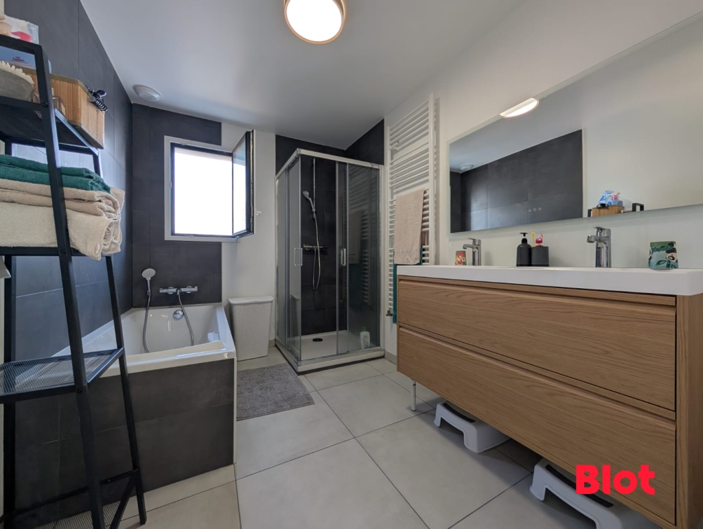 - Une salle de bains élégante et des rangements intégrés.