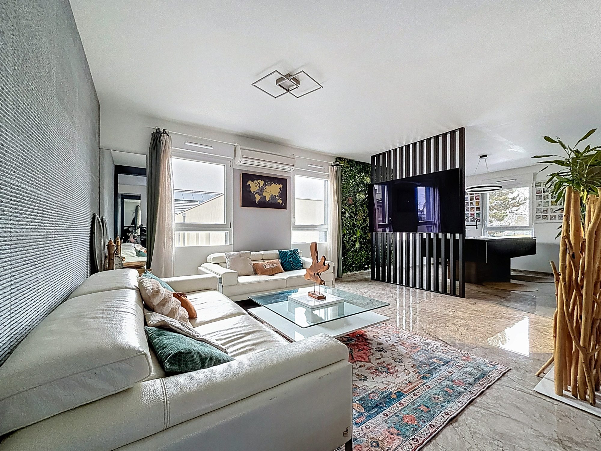 Elle se compose d'une entrée, d'une grande cuisine équipée haut de gamme, un salon / salle à manger proposant 43 m² tout ouvert et profitant d'une belle lumière, les sols sont traités avec des carreaux de grands formats, et d'une grande salle de bains proposant une douche italienne XXL avec WC ;