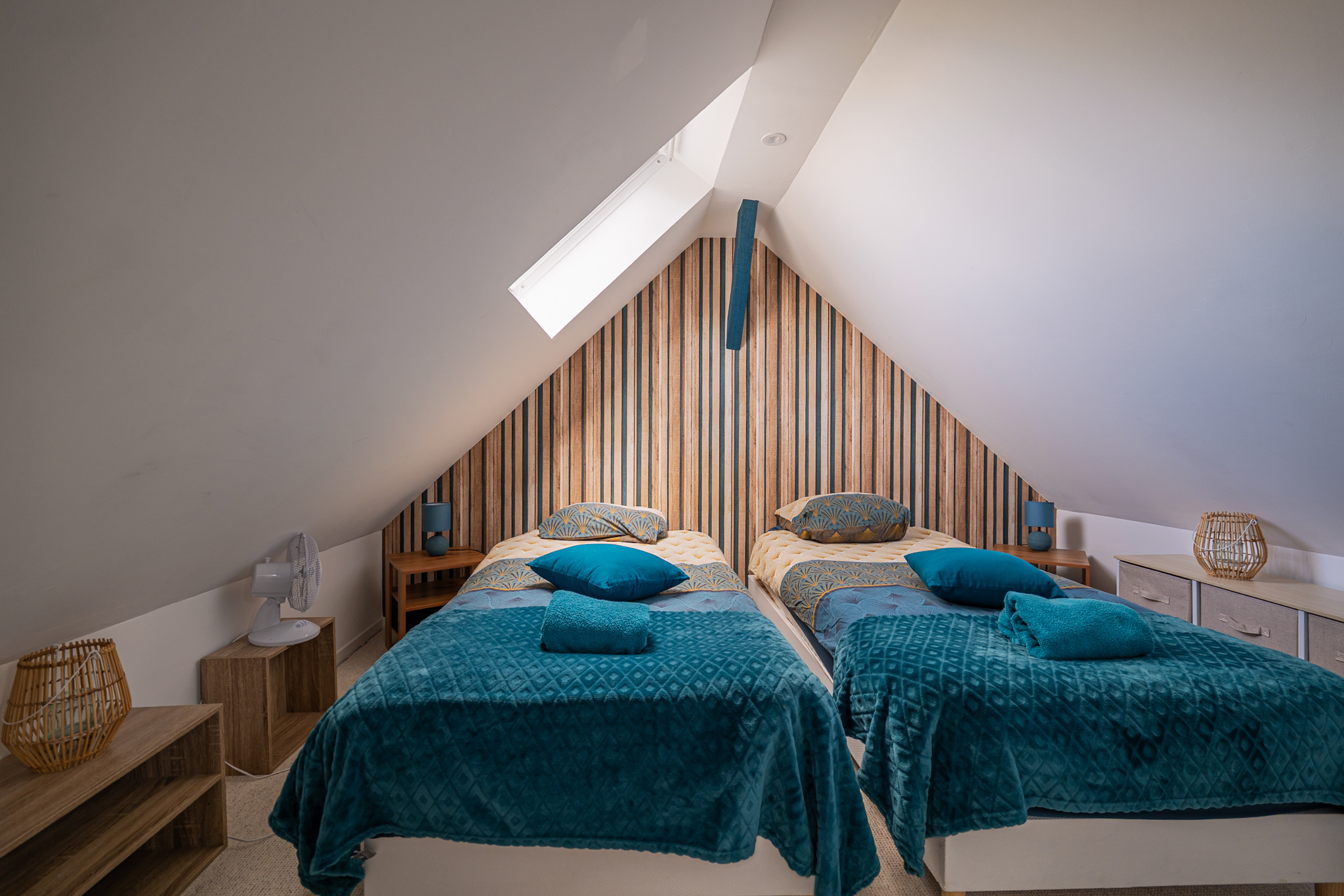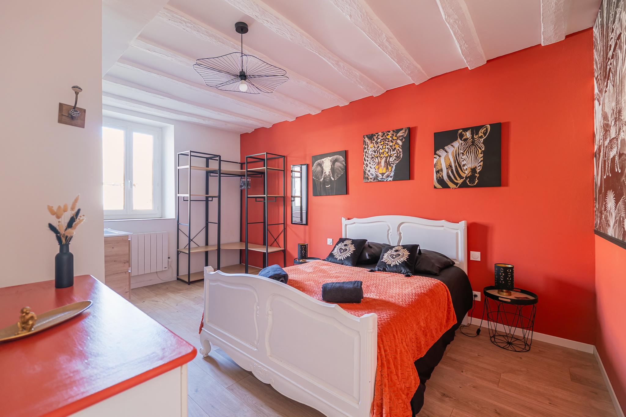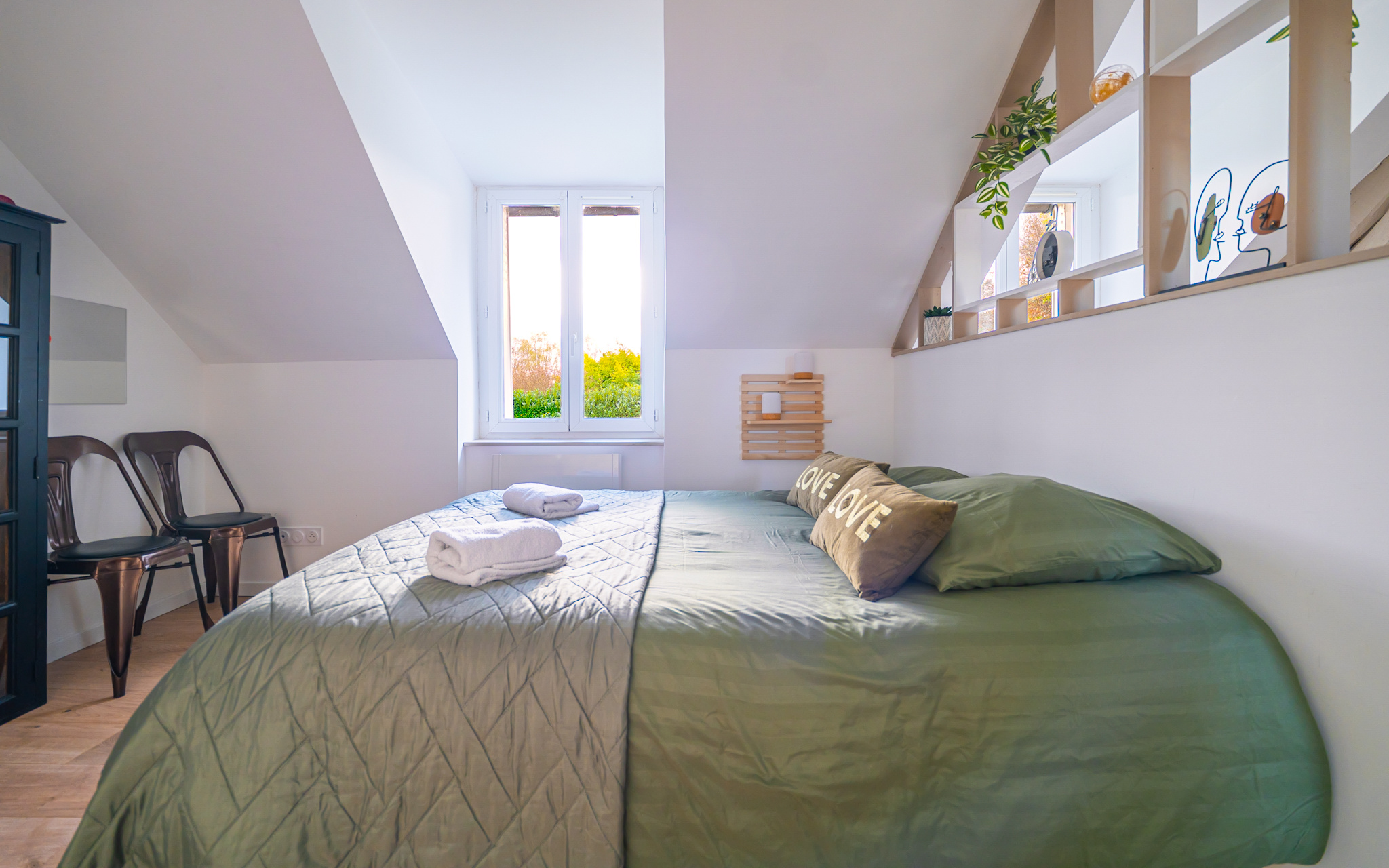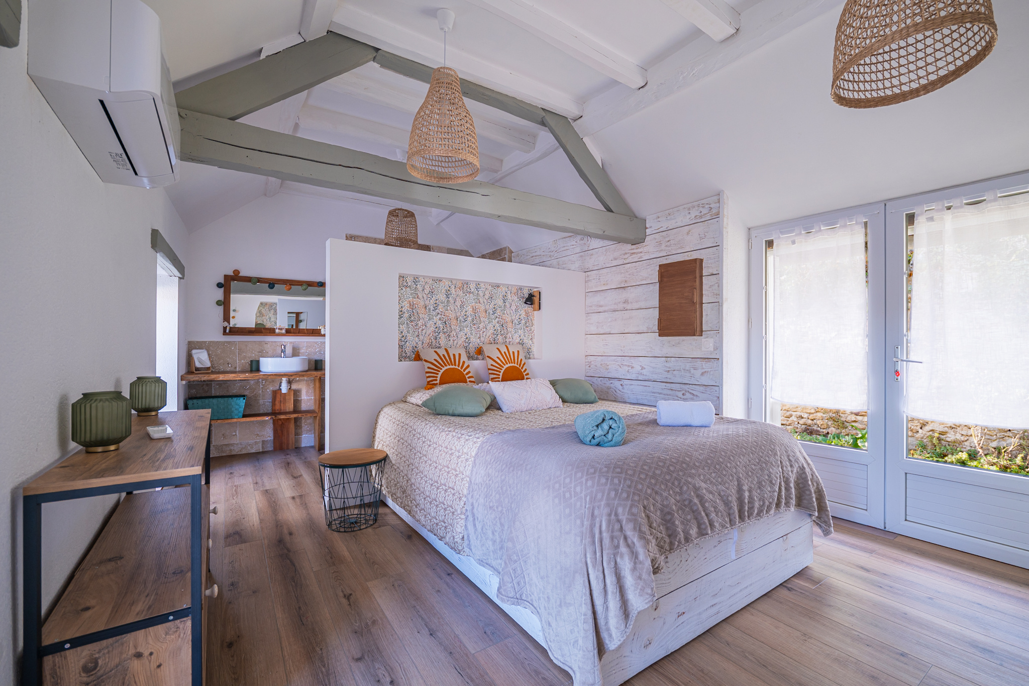 À l'étage, un premier escalier mène à une suite spacieuse avec sa salle d'eau, un second escalier mène à une chambre avec sa salle d'eau attenante.