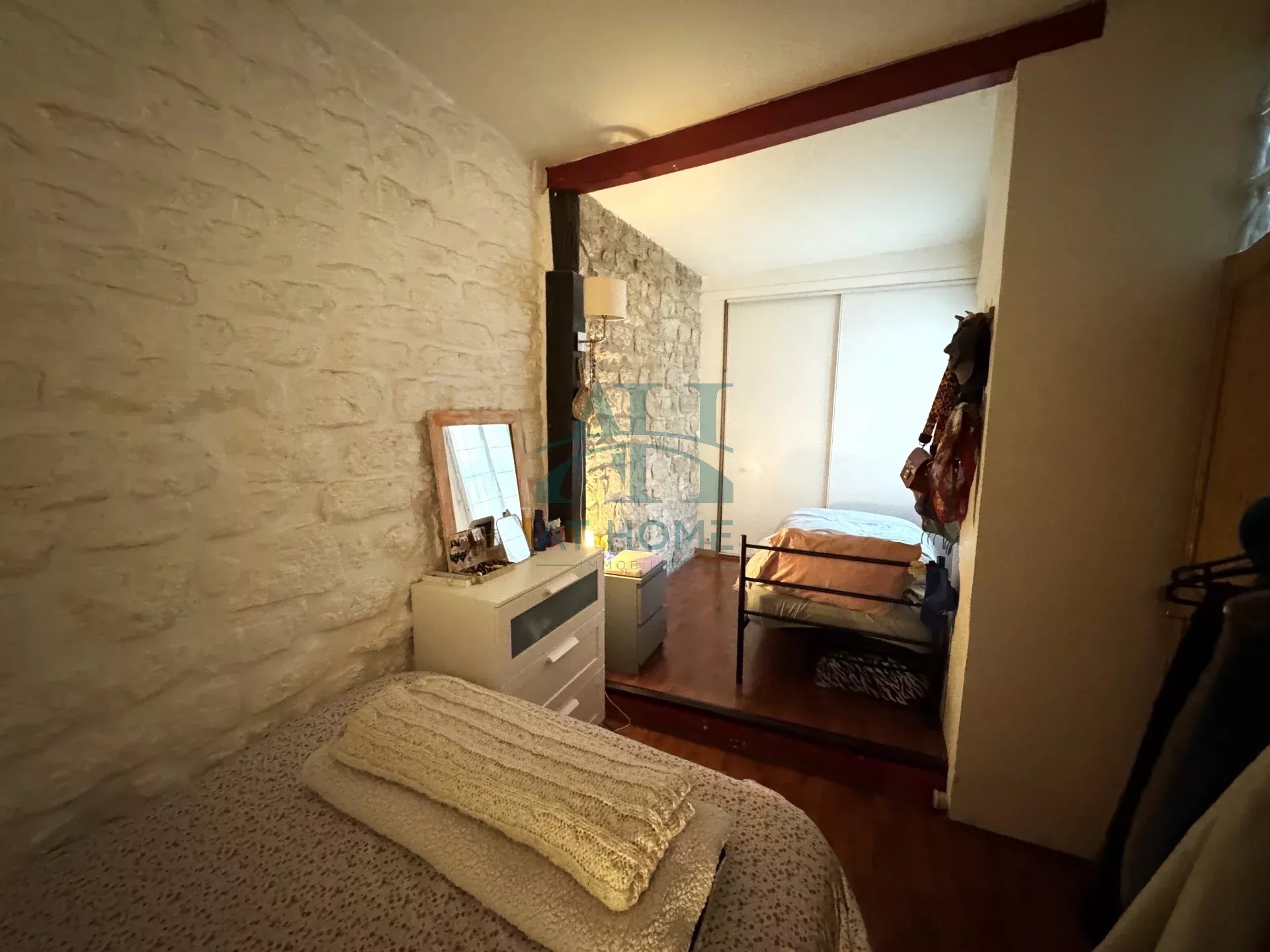 Le séjour offre un vrai cachet avec son mur en pierres apparentes. Il comprend également une cuisine séparée, une chambre double sur cour et une salle d’eau avec WC.