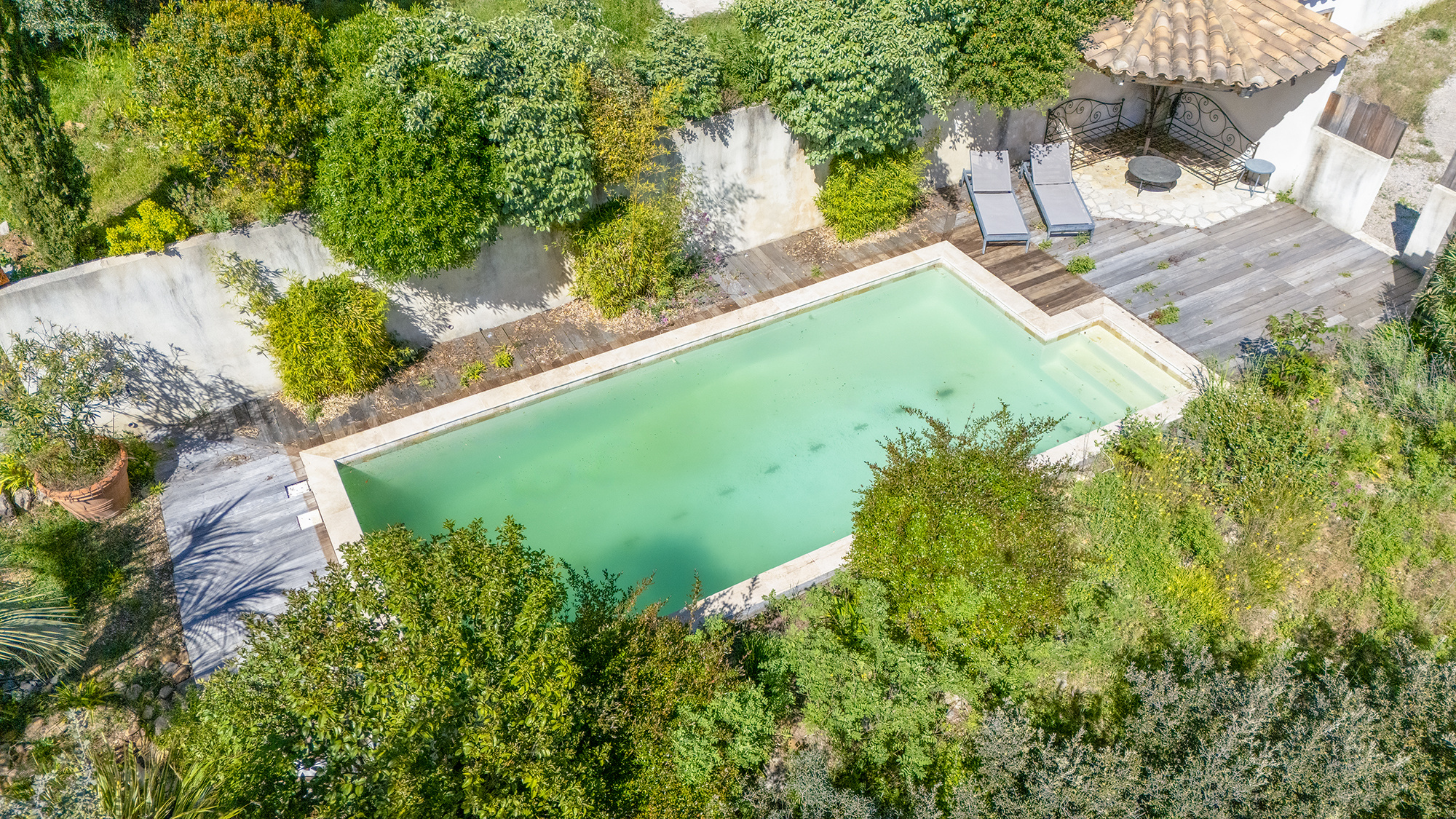 Une piscine traditionnelle 4/9 de 2008 dans un écrin de verdure avec plages, terrasses couvertes en partie et local technique.