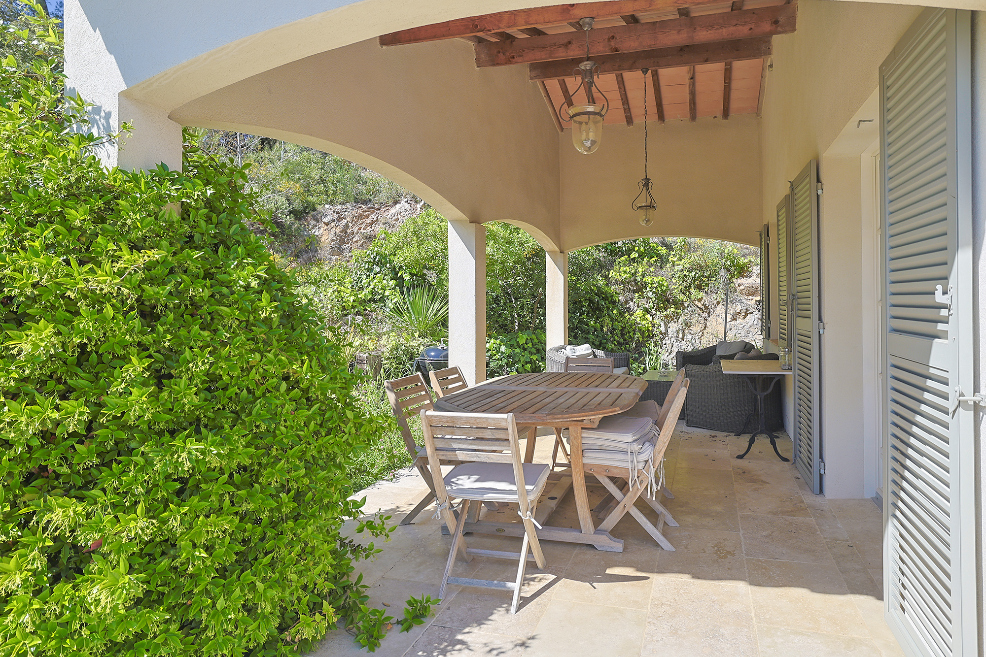 La maison est bordée par une terrasse ensoleillée avec vue sur la vallée, qui donne accès à l'entrée.
