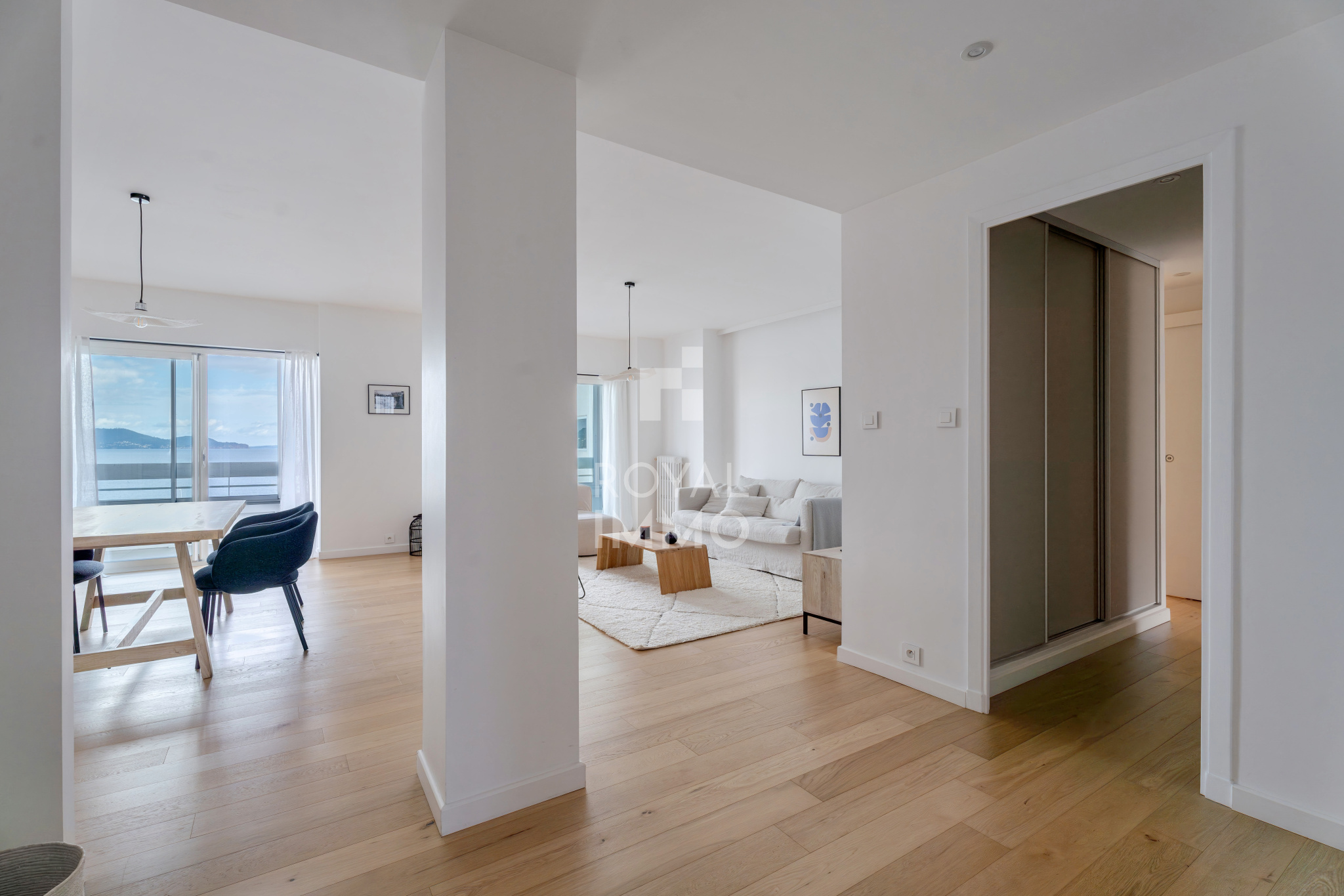 L'appartement se compose d'un vaste séjour d'environ 40 m2 baigné de lumière, ouvert sur la mer, d'une cuisine aménagée et entièrement équipée, de trois chambres climatisées avec placards, d'une salle d'eau moderne, ainsi que d'une loggia d'environ 20 m2, véritable espace de vie supplémentaire.