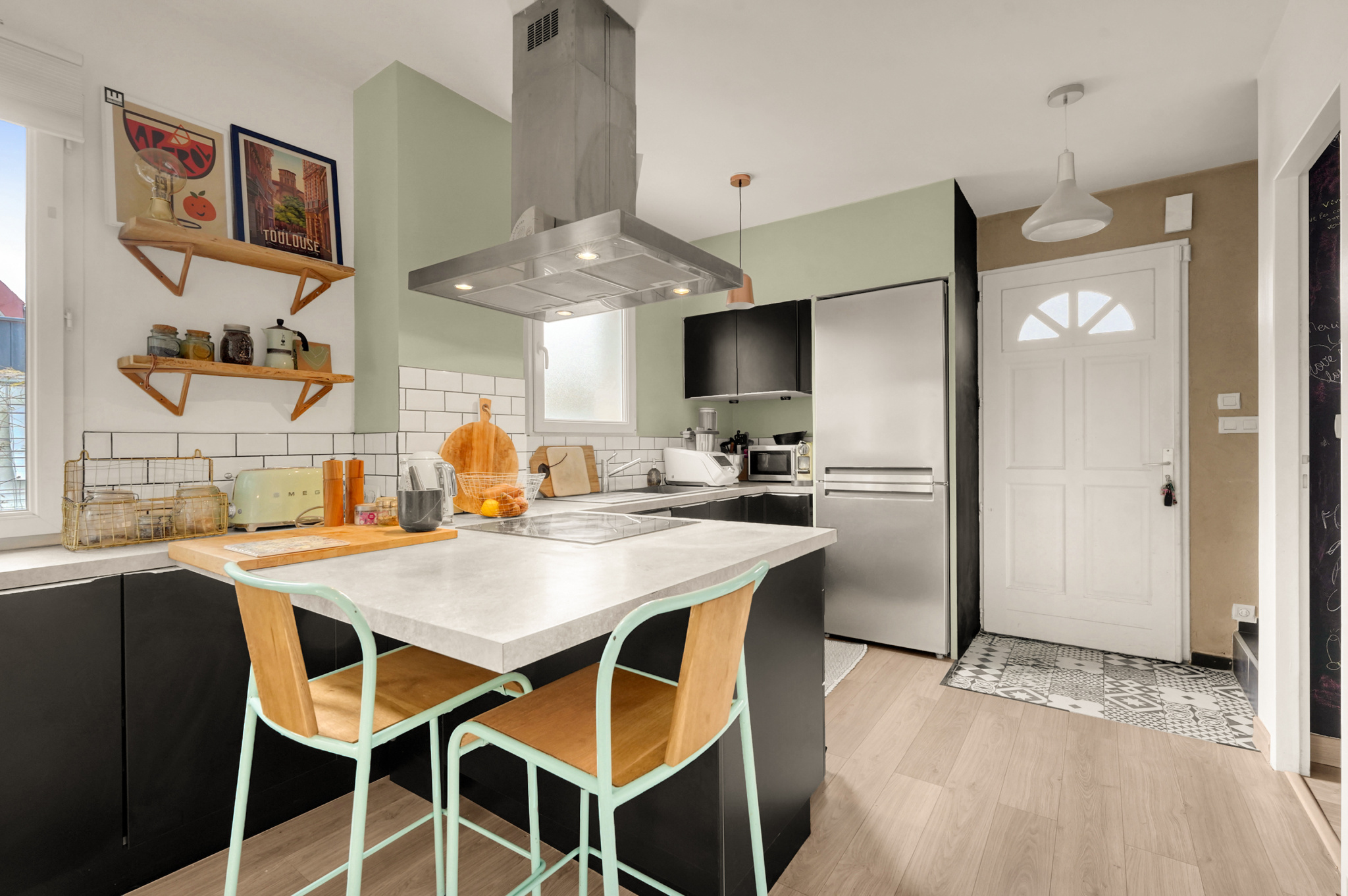 À l'étage, deux chambres climatisées de 14,1 m2 et 7,5 m2 donnent accès à une salle d'eau moderne comprenant une douche à l'italienne, une double vasque et un WC.