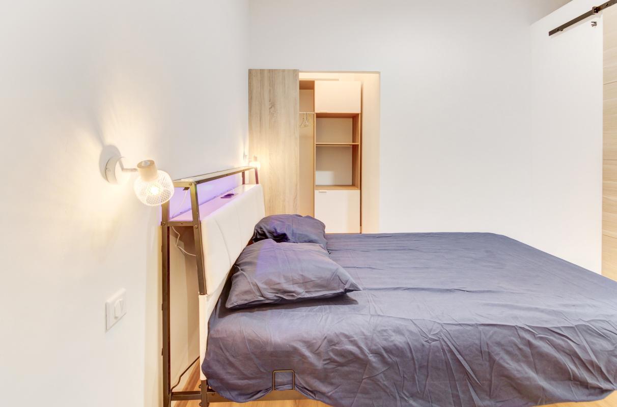 L'appartement offre une spacieuse pièce de vie avec coin cuisine à aménager, un espace nuit pratique et modulable ainsi qu'une salle d'eau contemporaine avec douche à l'italienne.
