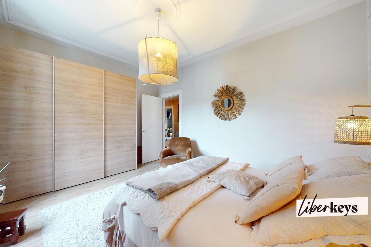 Dès le seuil de la petite copropriété l'esthétisme et le soin de la rénovation charme les visiteurs. On accède à l'appartements par une porte cochère du plus bel effet arrivant sur une entrée avec dressing de 6.9m² séparé du hall par une porte assurant l'isolation parfaite avec les parties communes. Le hall de 11.7m² distribue les autres pièces dont le salon séjours de 38.5m². Deux chambres aux volumes très généreux de 15.9m² et de 17.2m² comprenant un dressing. Une cuisine aménagée de 9m² et une salle de bain de 7.4m² comprenant une douche et une baignoire.