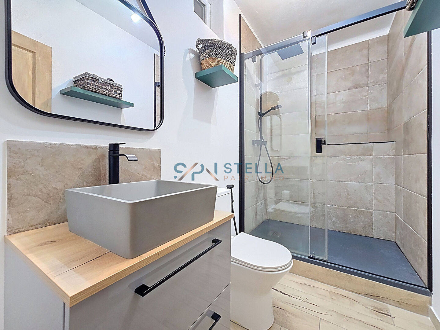 La salle d'eau, contemporaine et élégante, est équipée d'une grande douche à l'italienne.