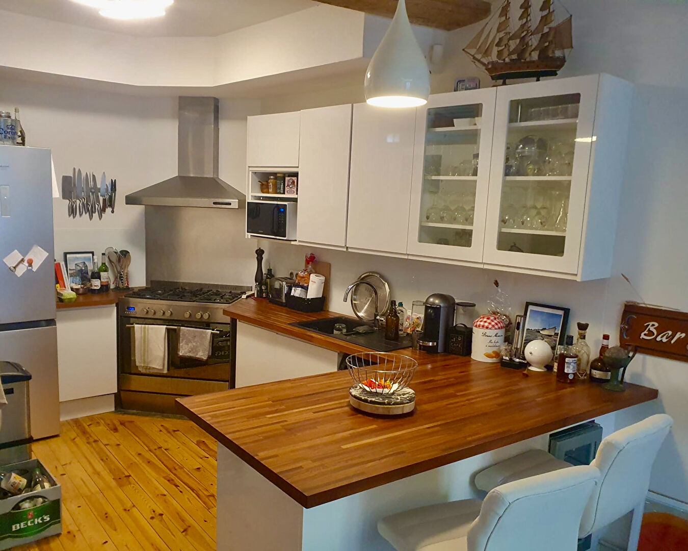 d'une pièce de vie lumineuse avec cuisine américaine moderne, entièrement équipée et ouverte sur le séjour