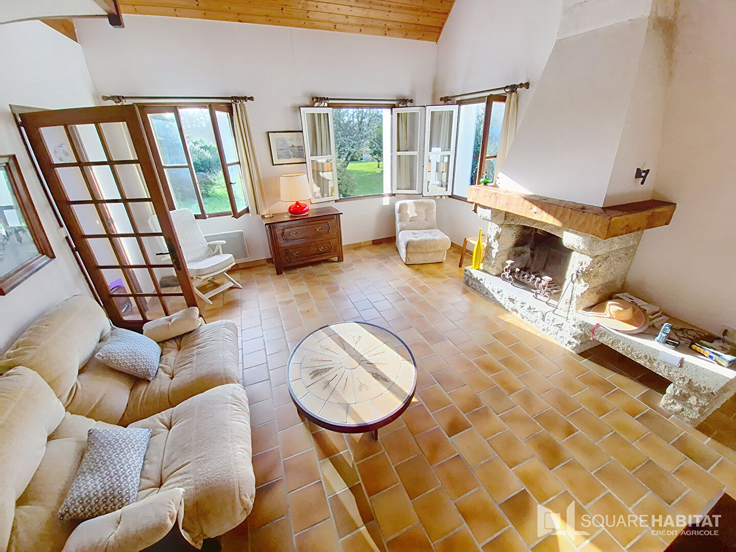 Au rez de chaussée: une entrée avec placard, grande cuisine fermée, salle de bains, WC, et un beau séjour cathédrale avec cheminée, chaleureux et lumineux.