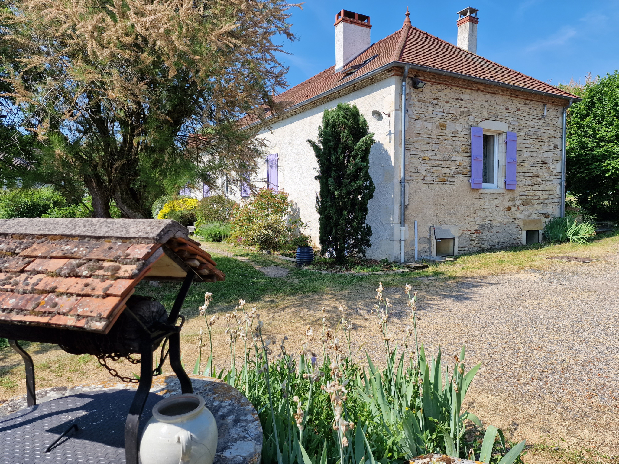 Terrasse arrière donnant sur une belle piscine 10x5m, cuisine d'été permettant de profiter de repas conviviaux au bord de l'eau. Maisonnette indépendante de 24 m2, offrant de multiples possibilités : atelier d'artiste, studio, espace de loisirs, etc. Le tout sur un très agréable terrain clos, fleuri et arboré d'environ 3000 m2 avec puits et abris.