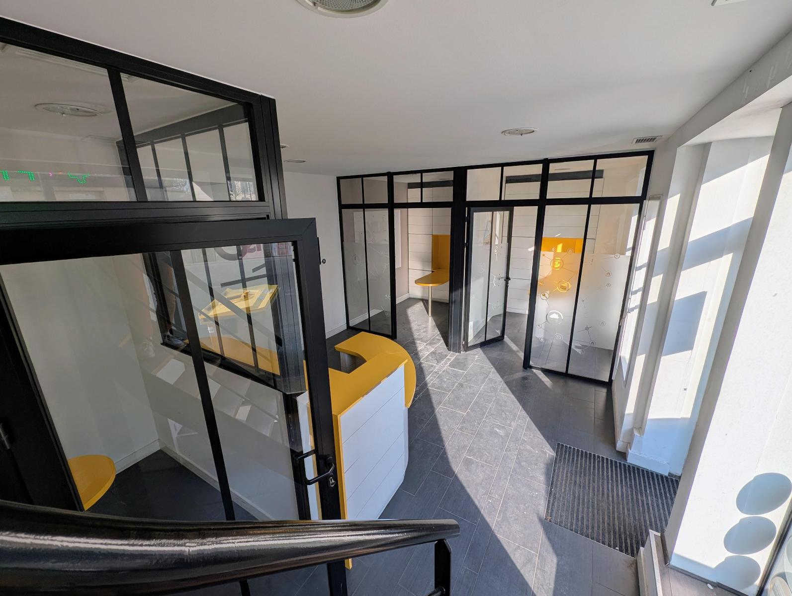 Le second local, d'une superficie de plus de 89 m², bénéficie également d'une belle visibilité grâce à ses deux grandes vitrines sur une rue commerçante et passante. Le rez de chaussée d'environ 40 m² s'ouvre sur une belle pièce d'accueil, 3 petits bureaux, une pièce supplémentaire et des wc. A l'étage, les 46 m² se composent de 2 grand bureaux, d'une réserve et de wc. Vendu libre de toute location/occupation.