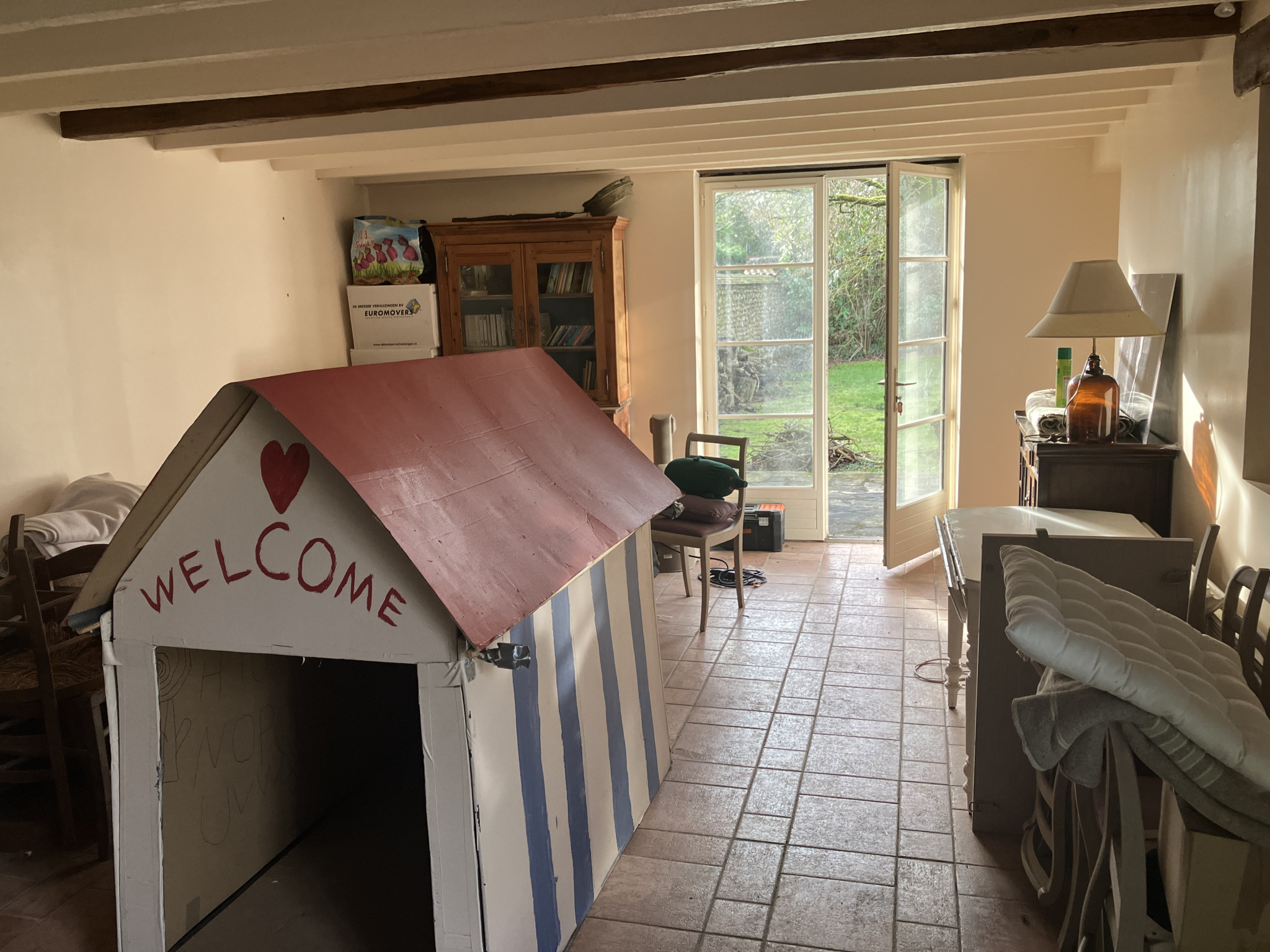 La maison d'amis comprend au rez-de-chaussée : entrée, salon de 25.20 m2, salle de douches/wc sanibroyeur de 2.27 m2. À l'étage : chambre de 18.55 m2.