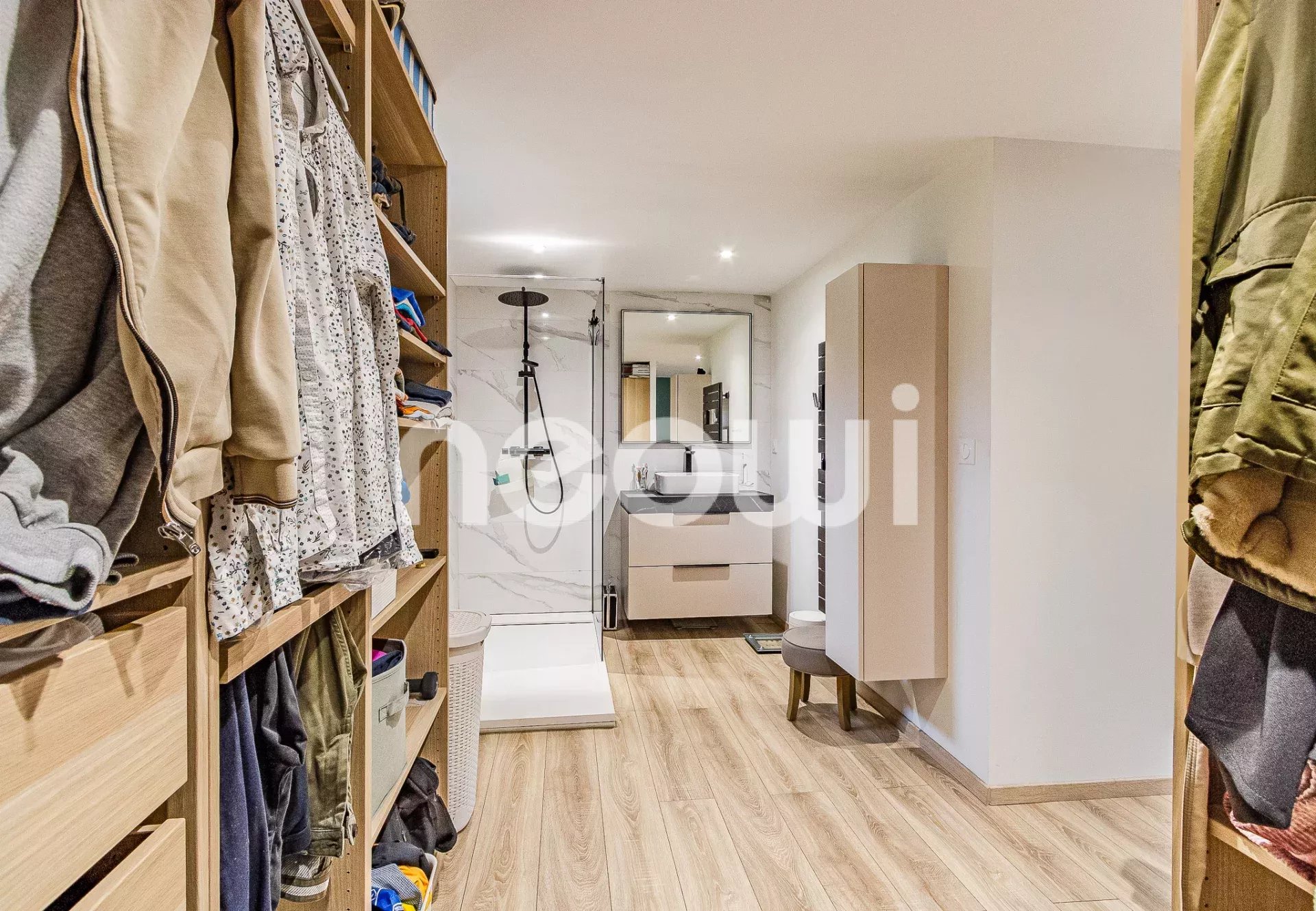 - d'une suite parentale récente et confortable comprenant un espace nuit, un dressing aménagé et une salle d'eau privative.