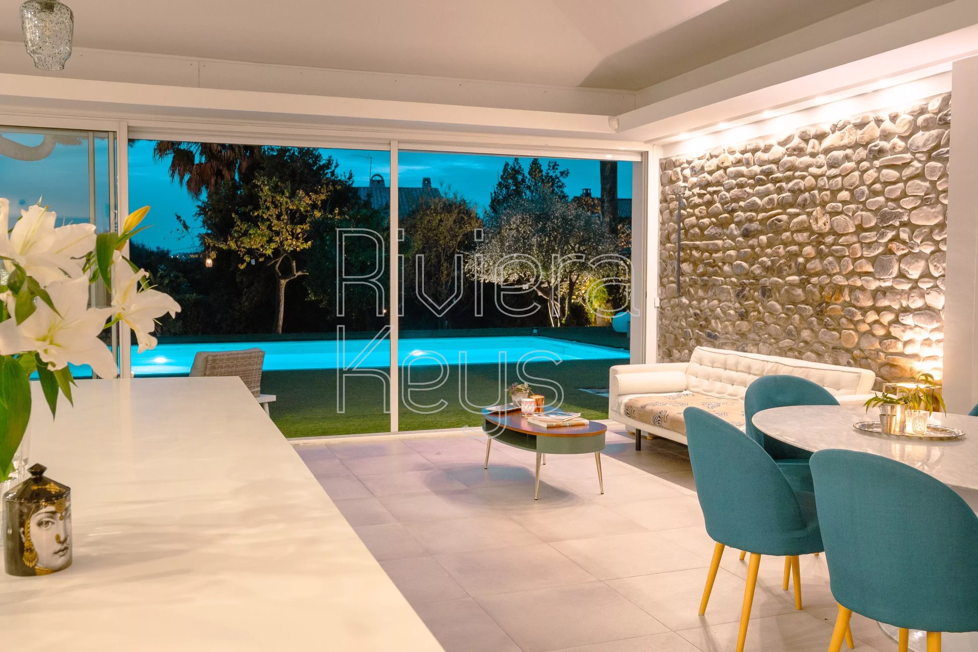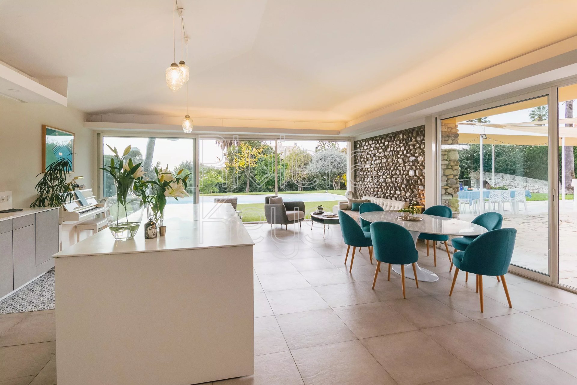 De plain-pied, pensée pour le confort, cette propriété propose une circulation fluide et un confort absolu; chaque pièce bénéficie d’une vue dégagée, entre mer et jardin, dans une atmosphère élégante et apaisante.