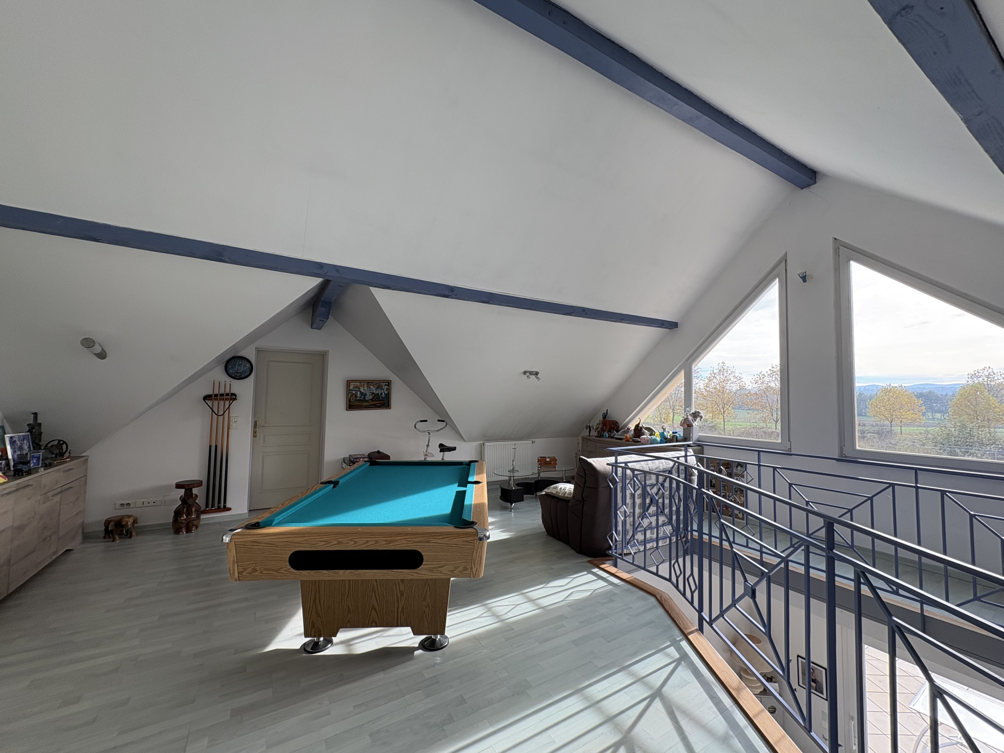 A l'étage : une mezzanine baignée de lumière surplombant la pièce de vie actuellement aménagée en espace de jeux. On y retrouve deux chambres disposant chacune de leur salle d'eau privatives +WC