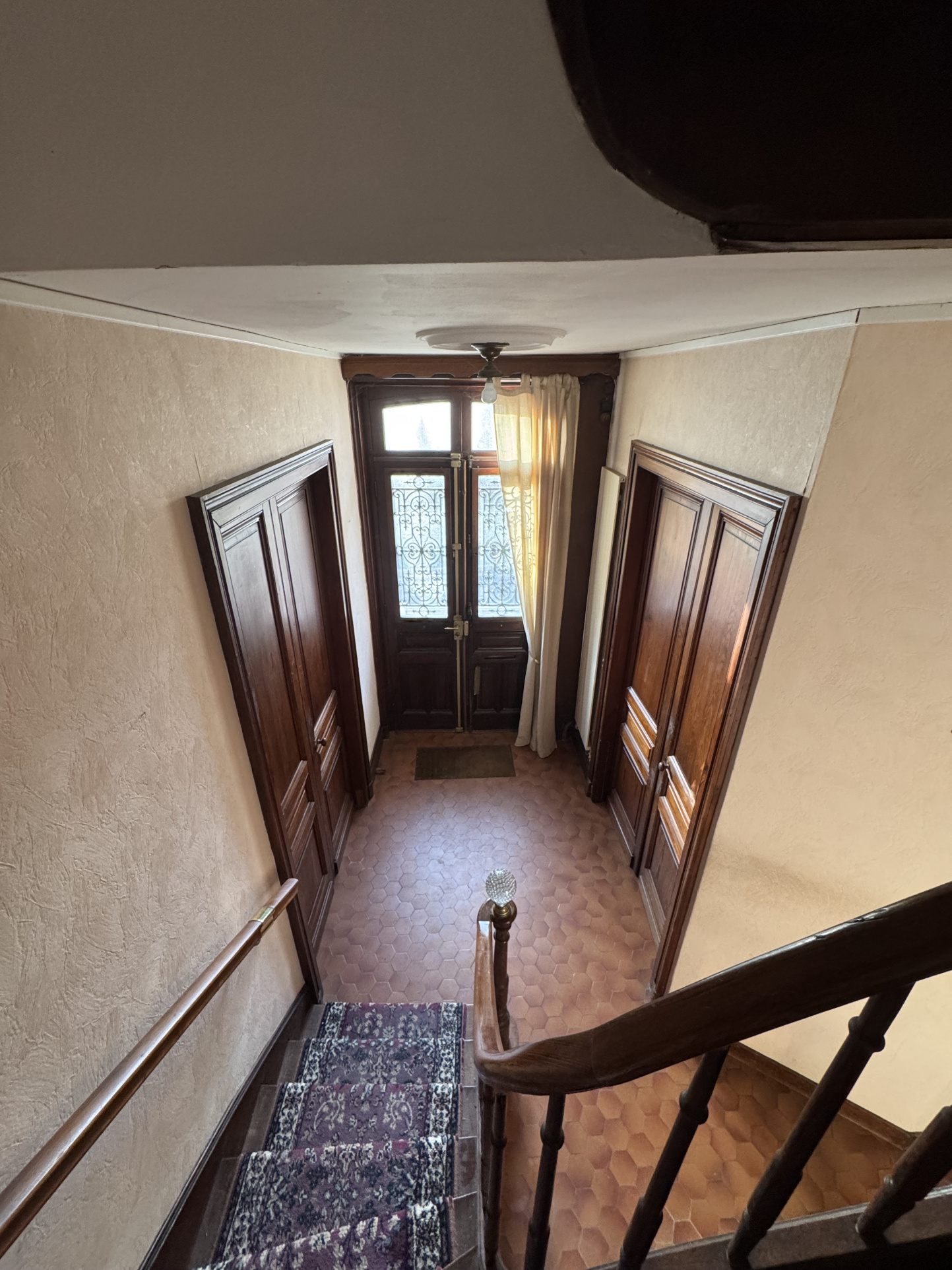 L'escalier central, véritable élément architectural, mène au premier étage comprenant deux grandes chambres, une salle de bain avec Wc, ainsi qu'un cabinet de toilettes avec balcon.