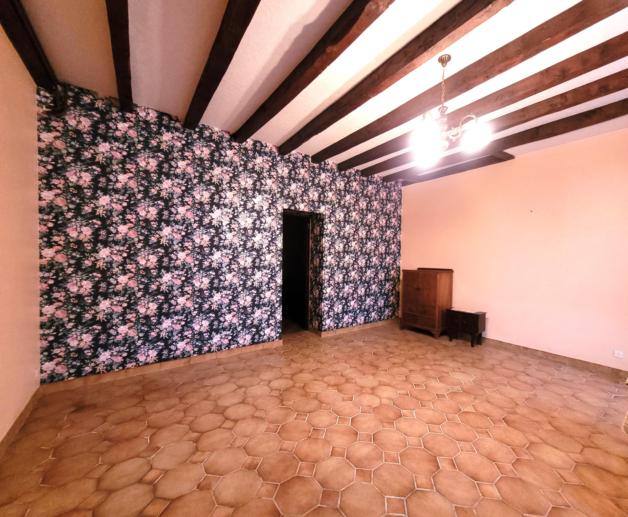 La maison propose au rez de chaussée un grand salon, un séjour de réception avec cheminée, une cuisine aménagée et équipée, une chambre, un wc et une salle d'eau.