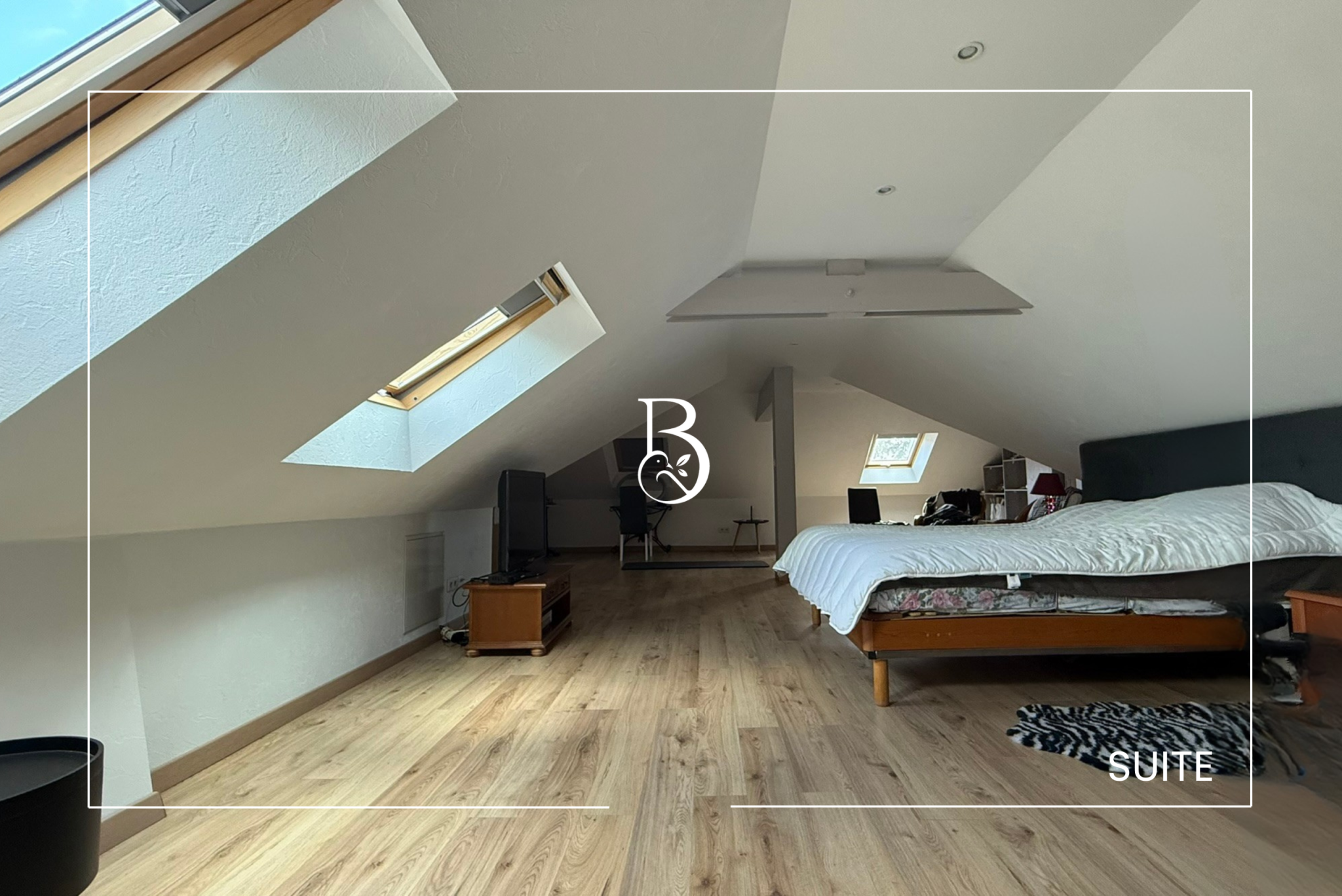 À l'étage : une suite aménagée dans les combles et encore du potentiel pour créer une chambre, un bureau ou un espace loisirs supplémentaire.