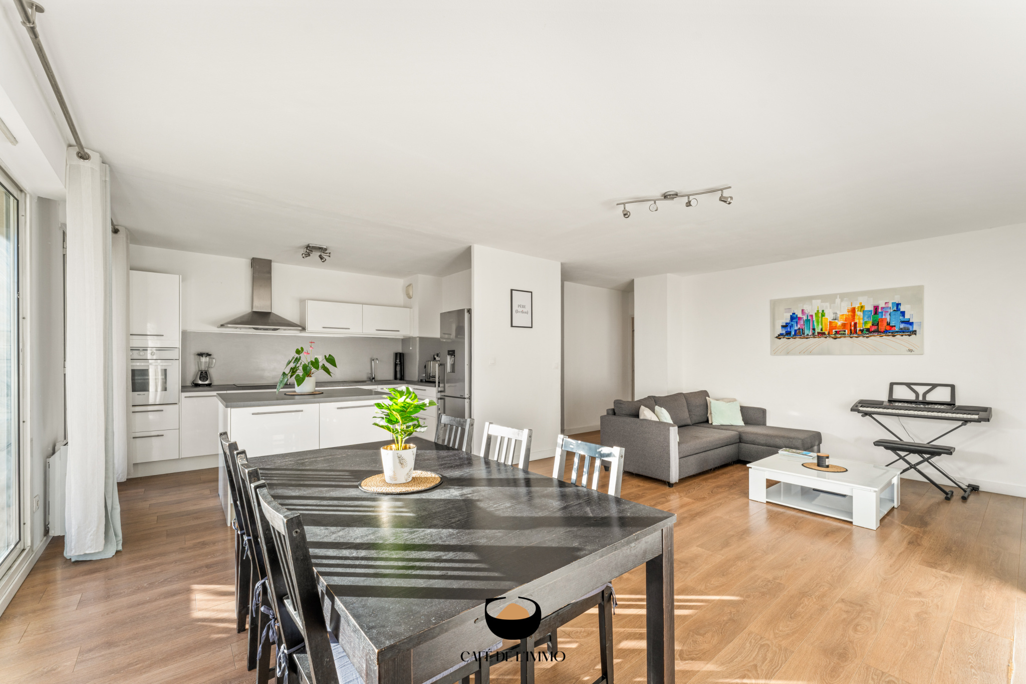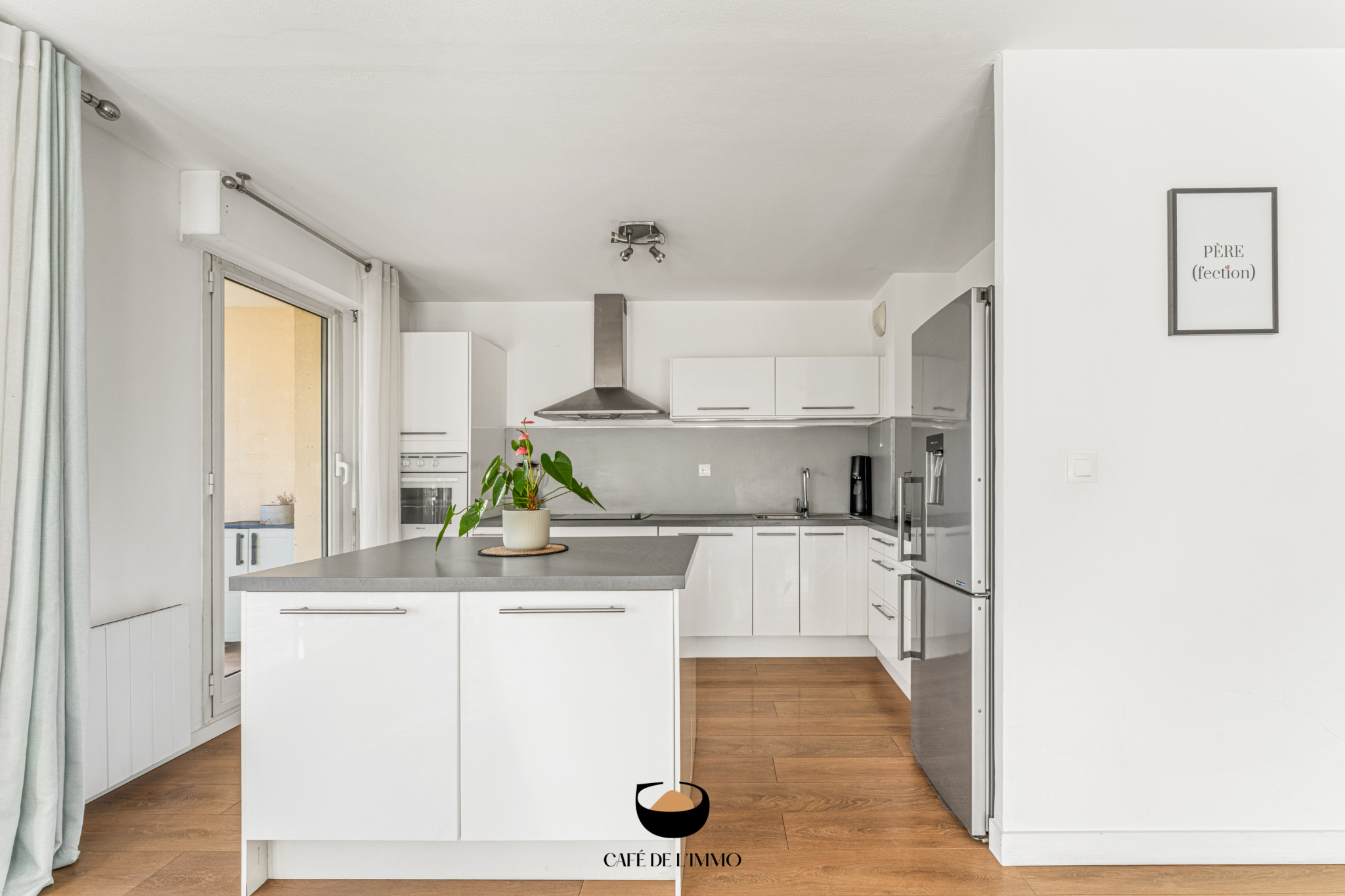 Passé l'entrée, découvrez une pièce de vie baignée de lumière de presque 40m2. La cuisine équipée, avec son îlot central, vient parfaire cet espace convivial.