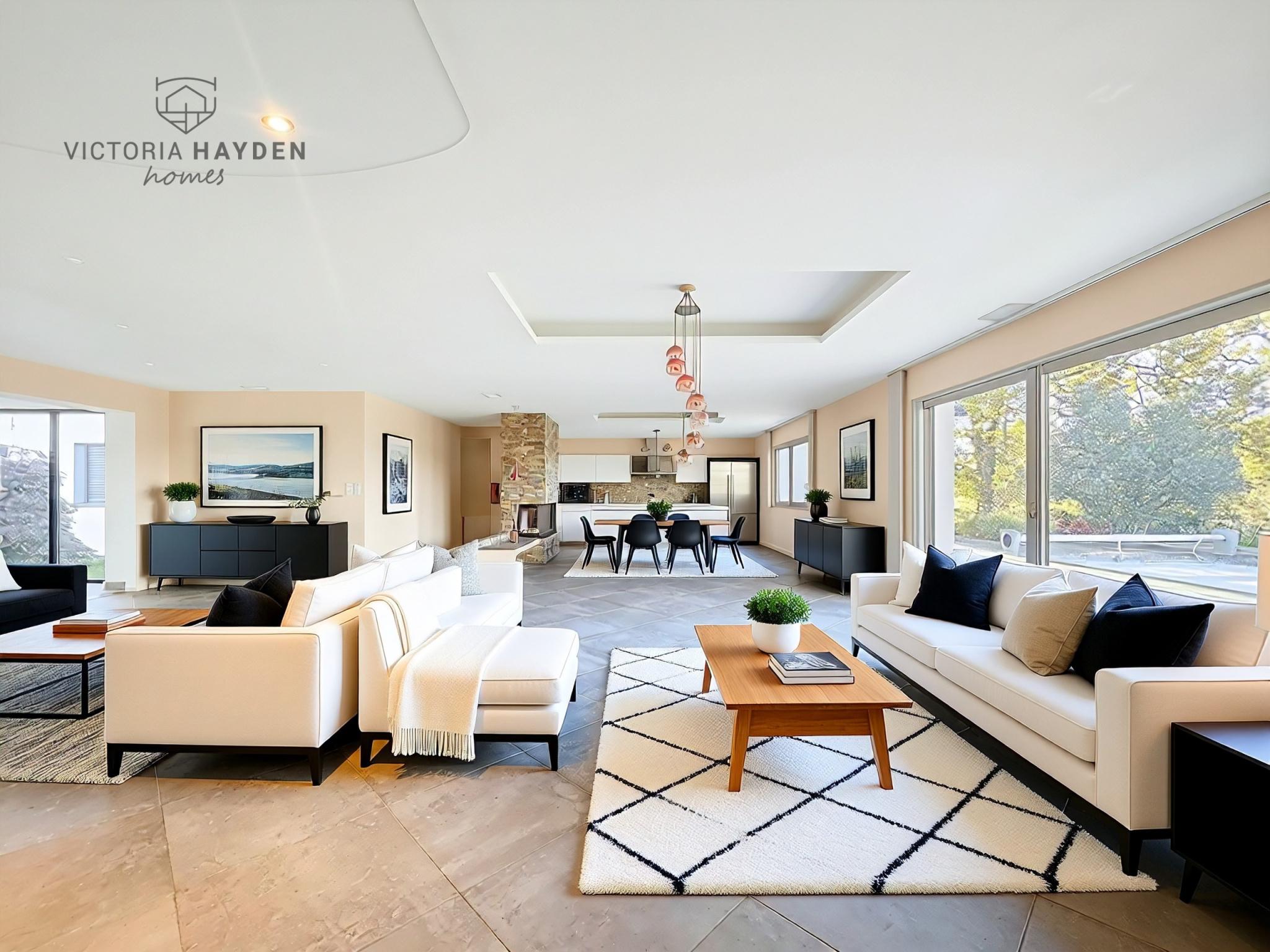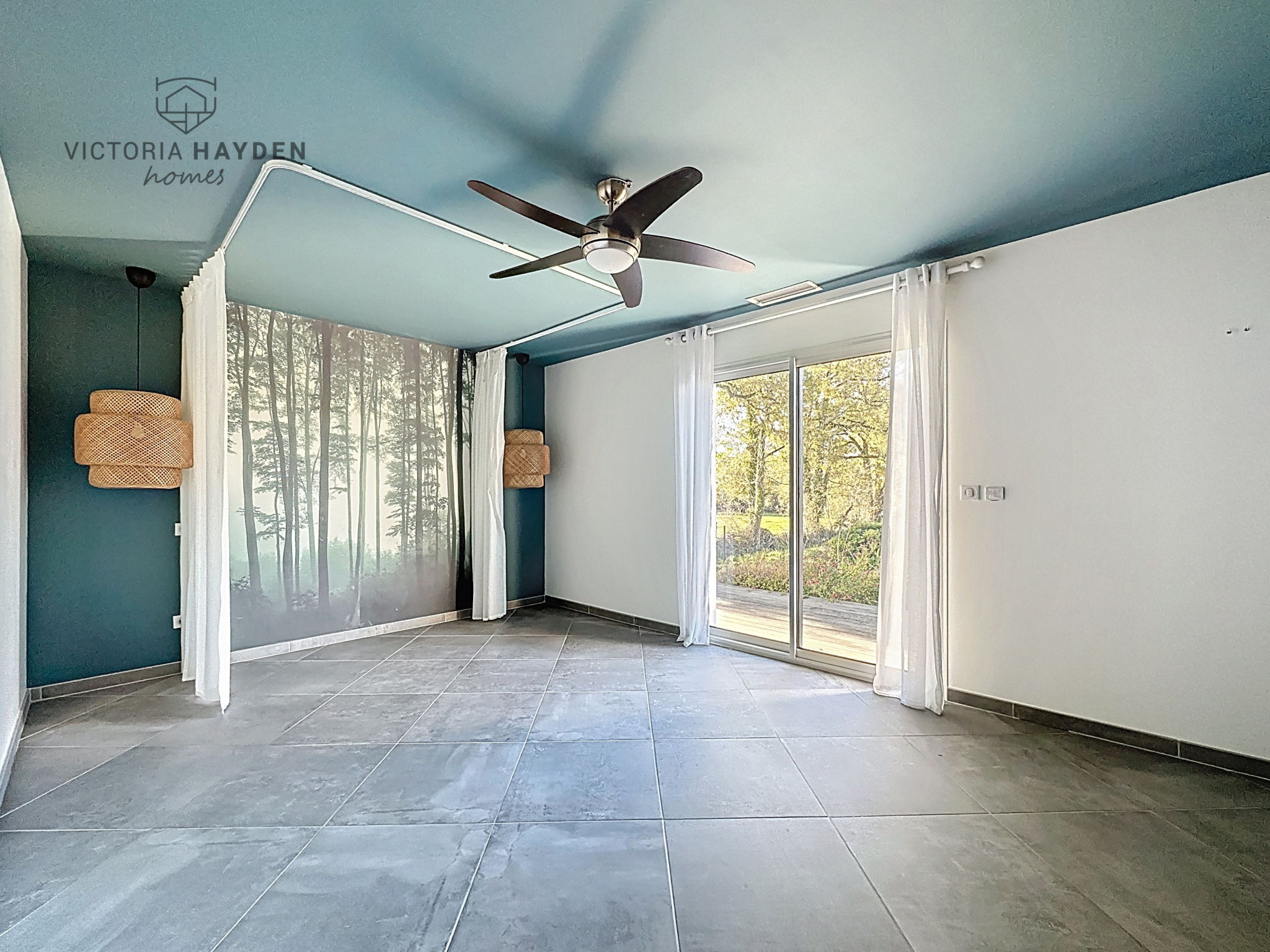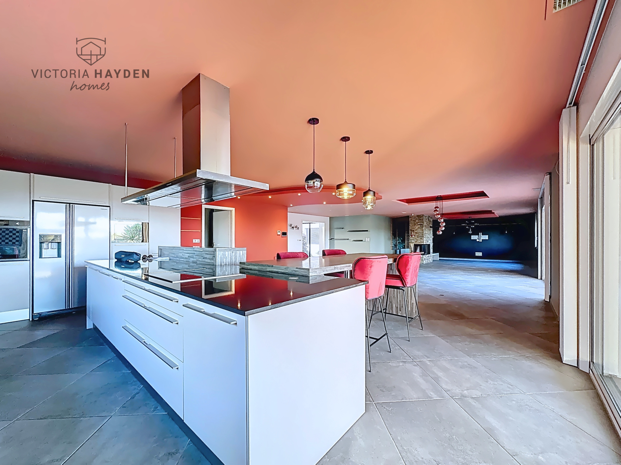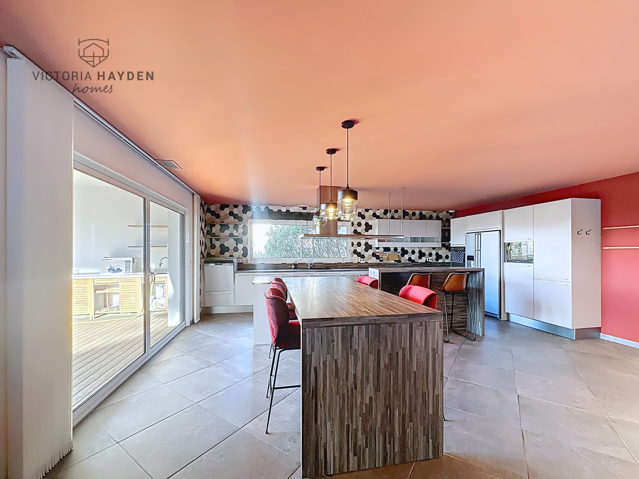 Elle offre des volumes remarquables, avec une pièce à vivre de 100 m2 composée d'un salon avec cheminée, d'une salle à manger et de baies vitrées à galandage. La cuisine ouverte dispose d'un îlot central, d'un coin repas et de nombreux rangements.