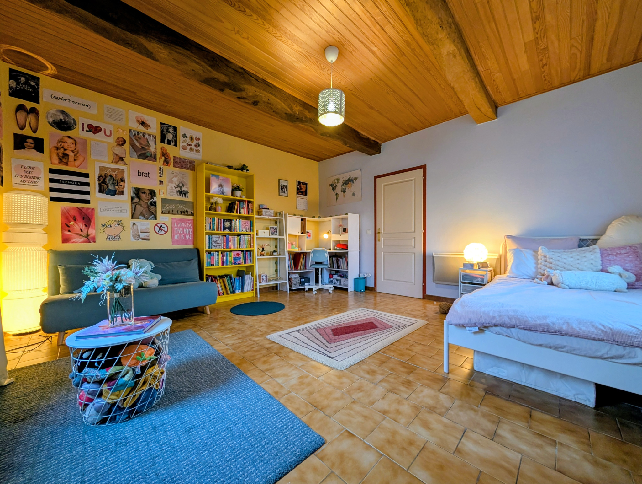 À l'étage, les combles partiellement aménagés proposent une grande pièce d'environ 70 m2 au sol, pouvant accueillir un espace loisirs, bureau, salle de jeux ou chambre supplémentaire. En complément, environ 100 m2 de combles offrent un potentiel d'aménagement supplémentaire.