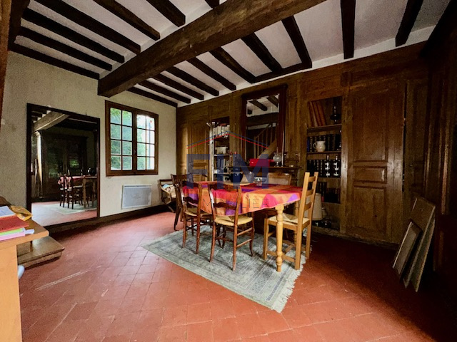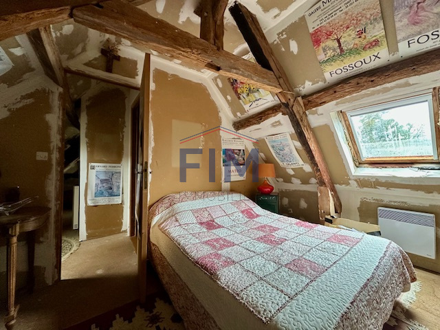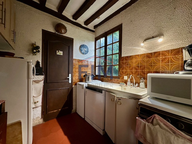 Au rez-de-chaussée, vous découvrirez un salon chaleureux agrémenté d'une cheminée ouverte, un séjour avec placards intégrés, une cuisine, ainsi qu'une petite chambre et une salle d'eau avec WC.