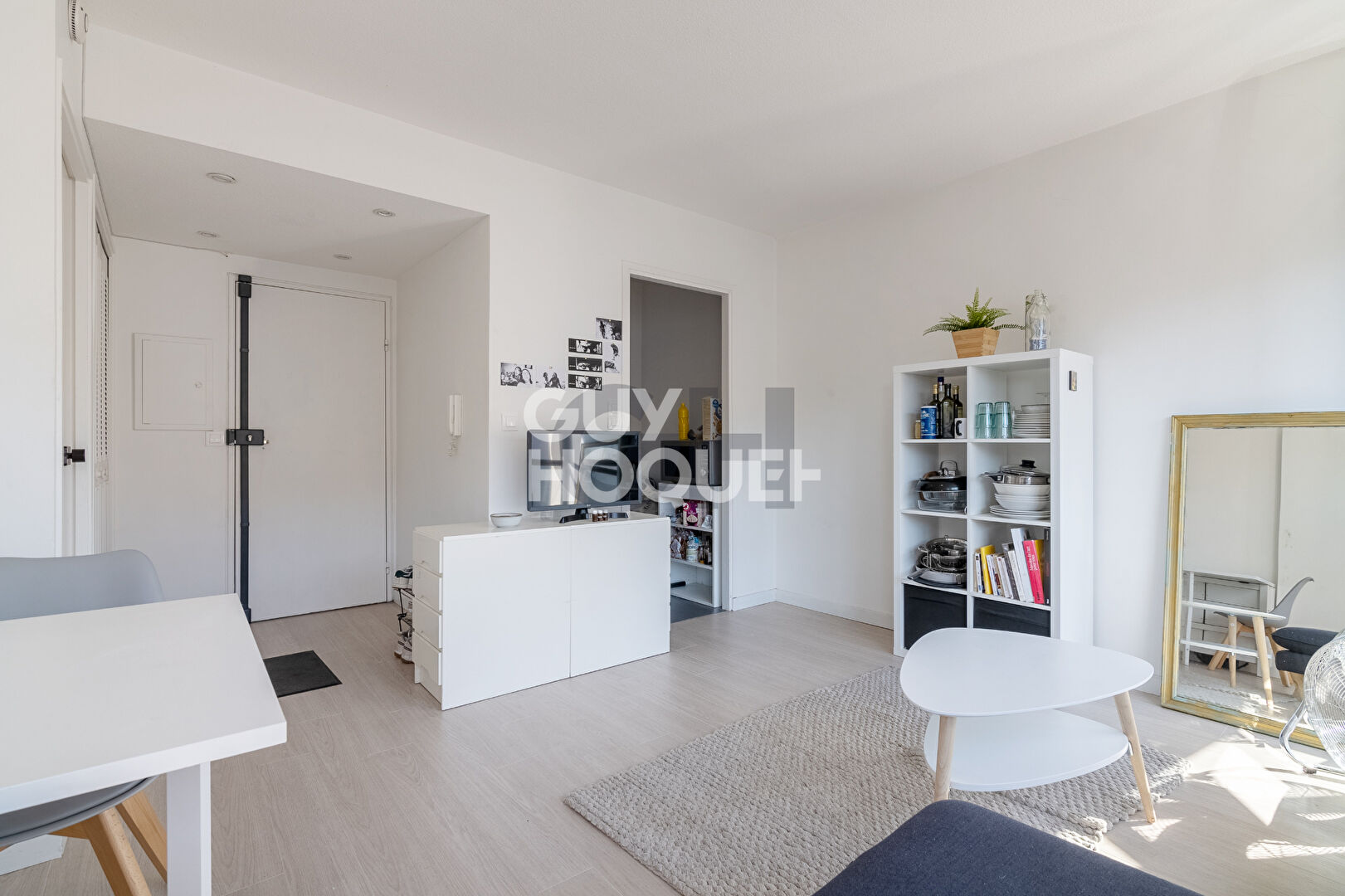 Dès l'entrée, vous découvrirez un espace optimisé avec placard, ouvrant sur un séjour baigné de lumière grâce à de grandes ouvertures. Le coin cuisine, moderne et entièrement équipé (plaque induction, hotte, réfrigérateur), s'intègre parfaitement à l'espace de vie.