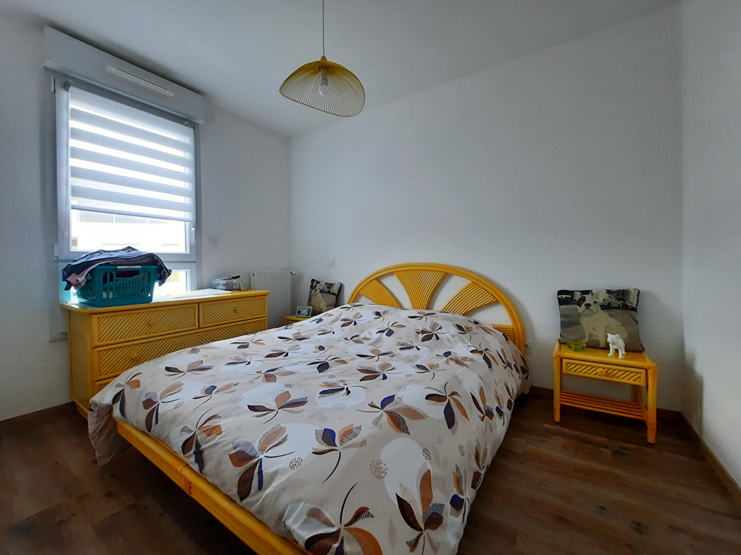 Il se compose d'une entrée, d'un séjour-cuisine avec accès au balcon exposé Sud-ouest, deux chambres et une salle d'eau avec WC séparés.