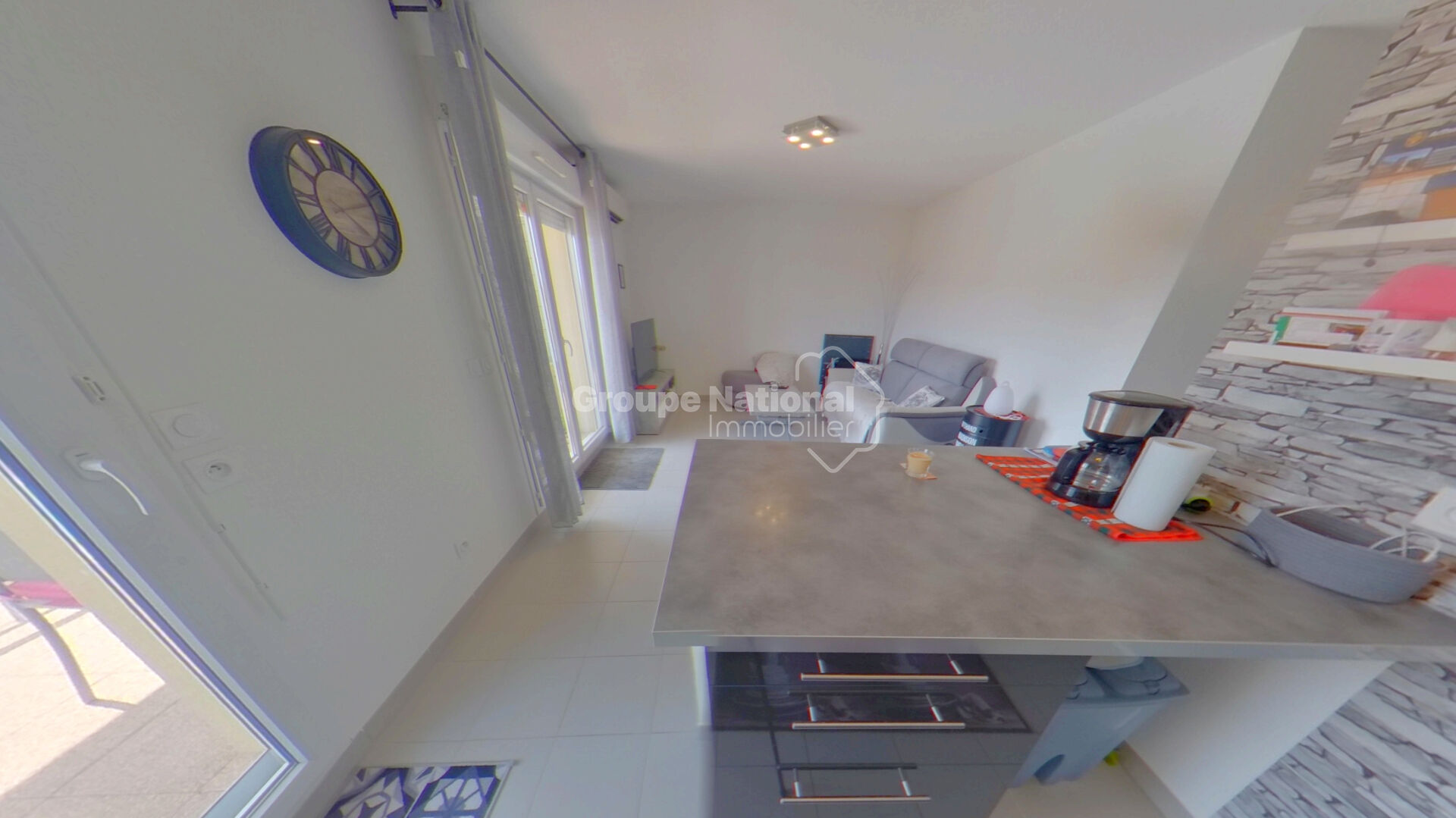Une entrée sur couloir avec placard, chambre avec deux placards, une salle de bain, WC séparé, un séjour avec accès terrasse avec vue sur la piscine de la résidence, une cuisine ouverte, aménagée de placards hauts et bas, d'un ilot central et équipée d'électroménagers. Garage fermé.