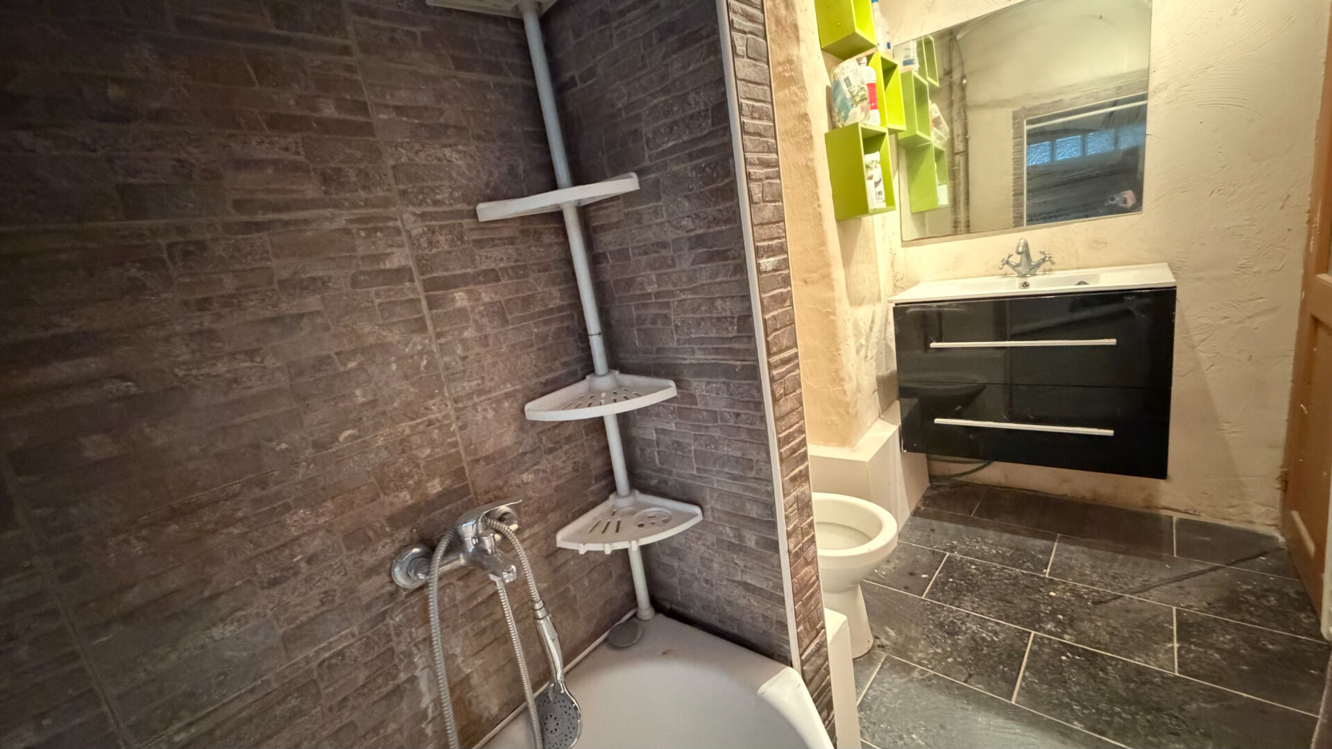 Le bien comprend trois chambres, une salle de bains et des WC. Vous bénéficierez également d'une pièce voûtée aveugle, d'un garage d'environ 30 m² ainsi que d'une cave, offrant de beaux espaces de rangement.