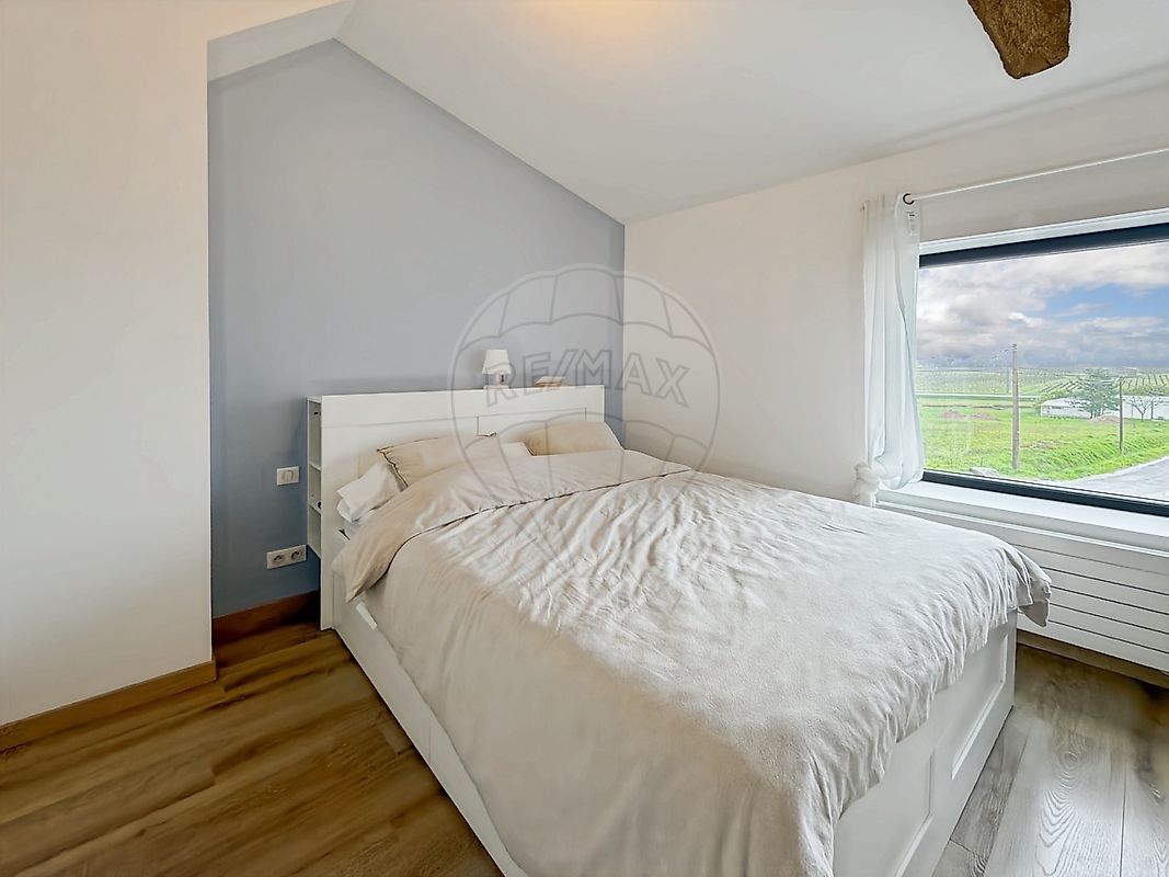 Un magnifique escalier mène à l’étage, où un palier ouvert dessert trois belles chambres avec placards, dont une avec dressing attenant. De grandes fenêtres baignent cet espace de lumière, mettant en valeur les poutres anciennes.