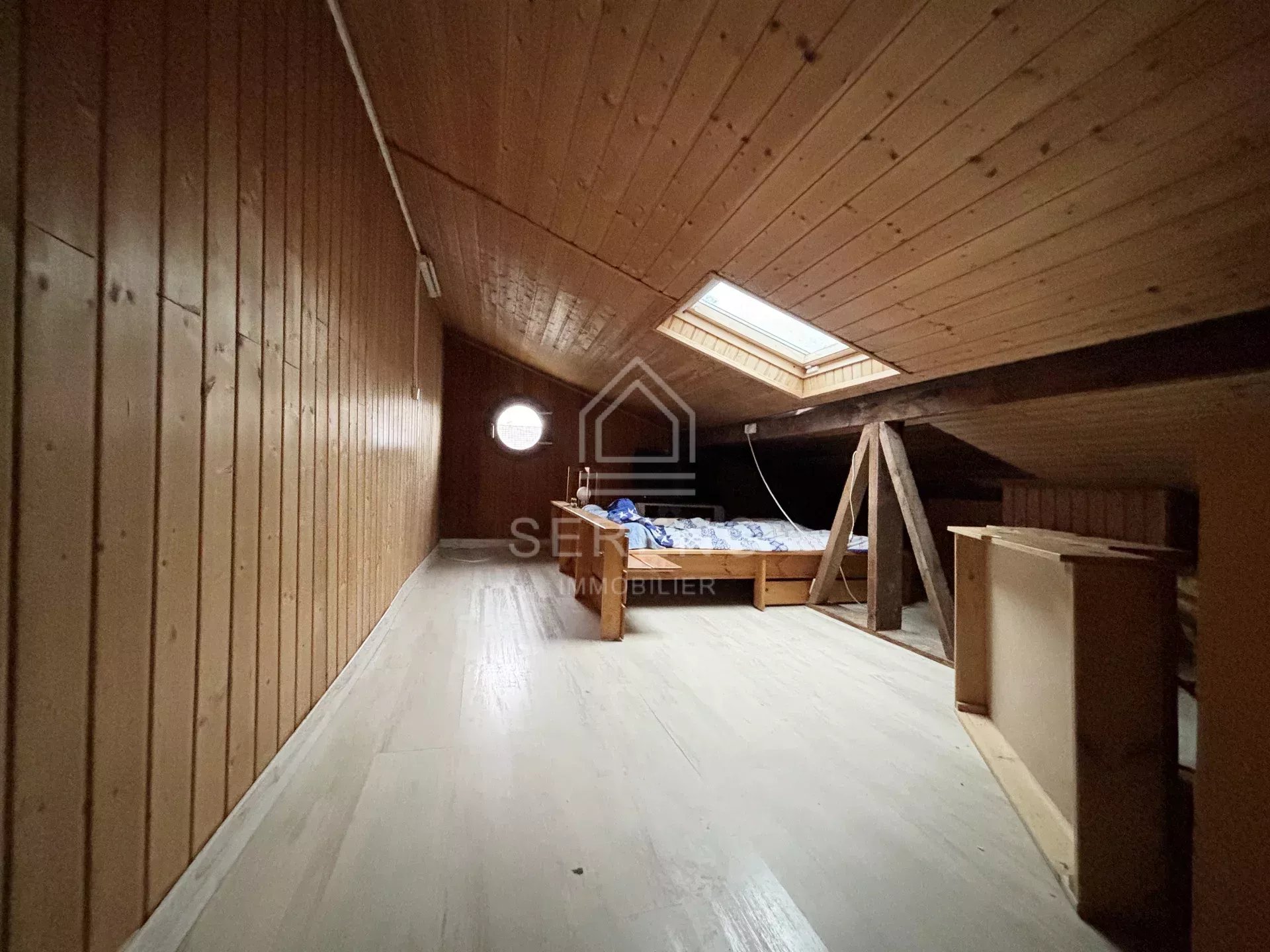 A l'étage : une chambre de 10 m², un bureau ou une chambre sous comble de 3.60 m² mais 24.70 m² au sol.
