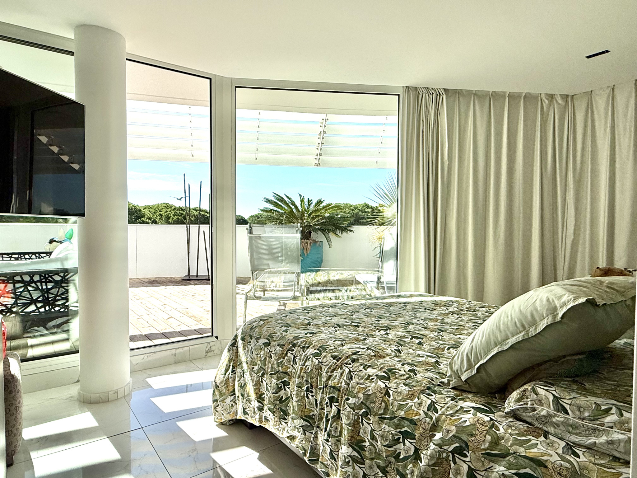 Installé au 3ème et dernier étage avec ascenseur, cet appartement unique développe 122 m2 habitables aux volumes généreux et aux prestations haut de gamme. Il s'ouvre sur une exceptionnelle terrasse de 112 m2 à triple exposition, idéale pour profiter pleinement du climat méditerranéen.