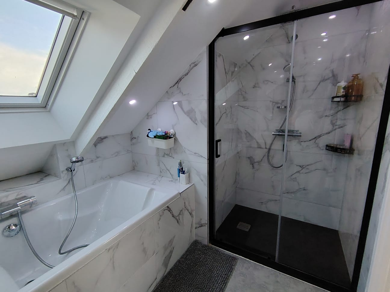 À l'étage, l'espace nuit se compose de trois chambres, dont une avec salle d'eau privative, d'une pièce polyvalente pouvant accueillir un bureau ou une salle de jeux, ainsi que d'une spacieuse salle de bains équipée d'une baignoire et d'une douche. Un WC séparé complète ce niveau.