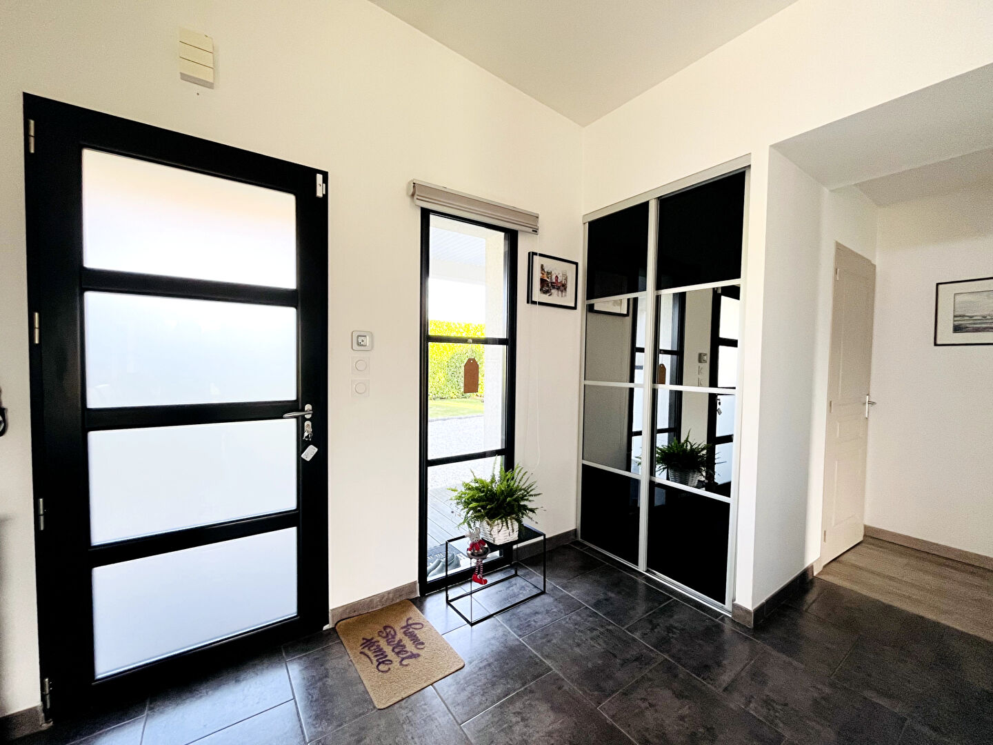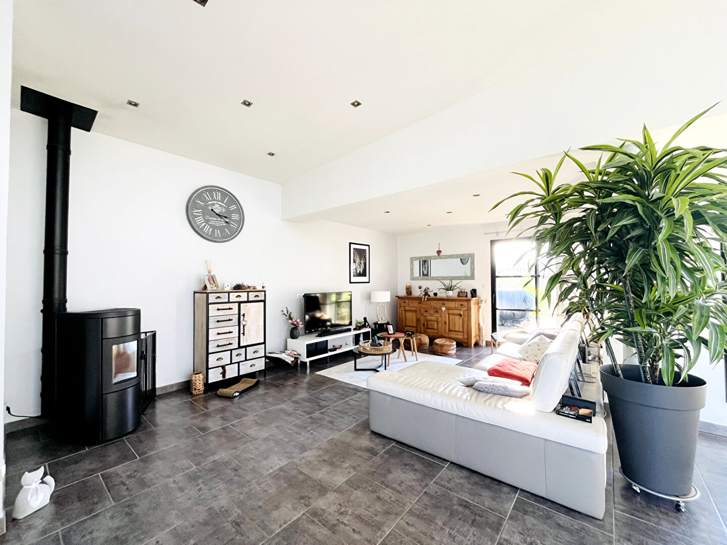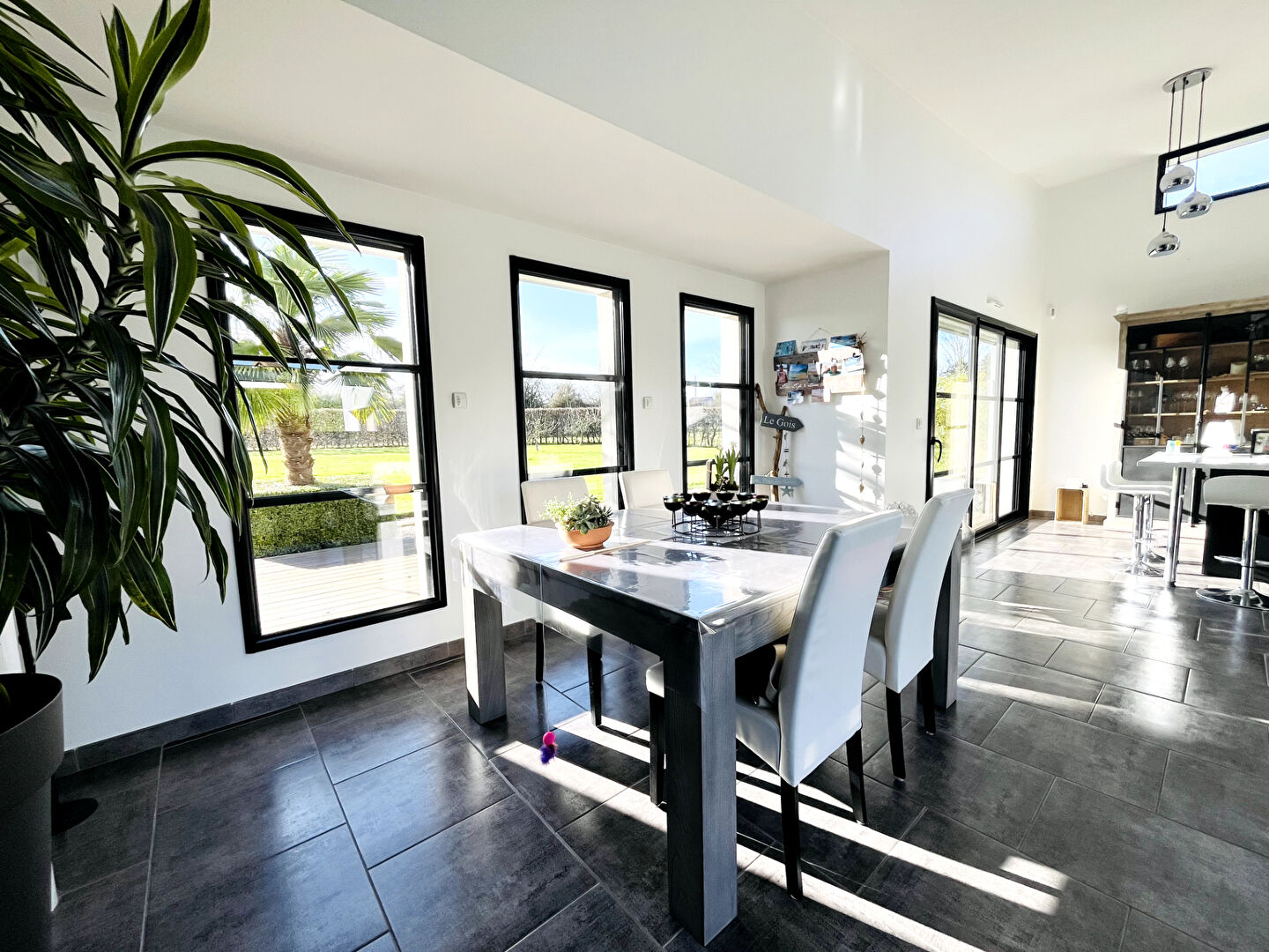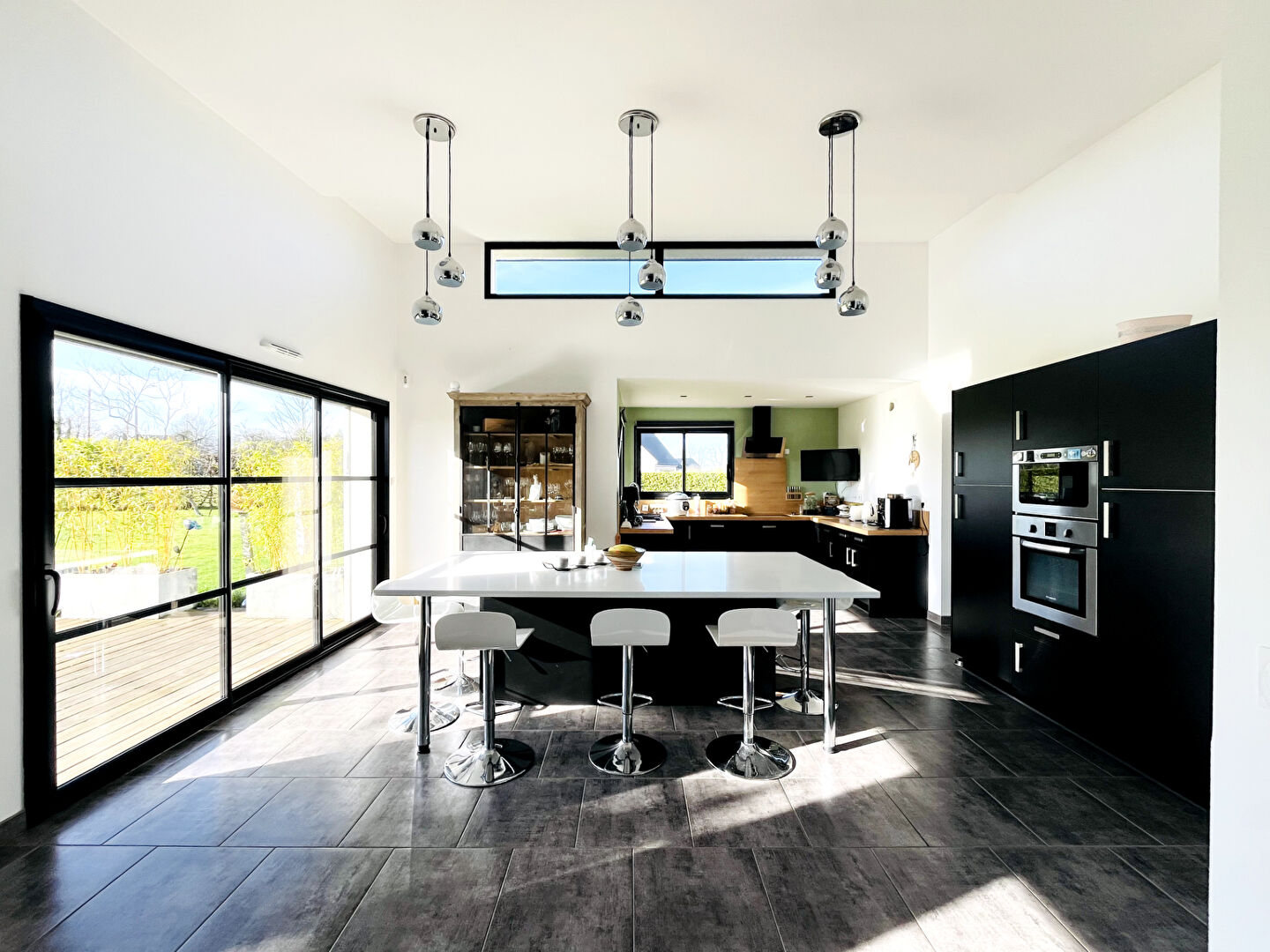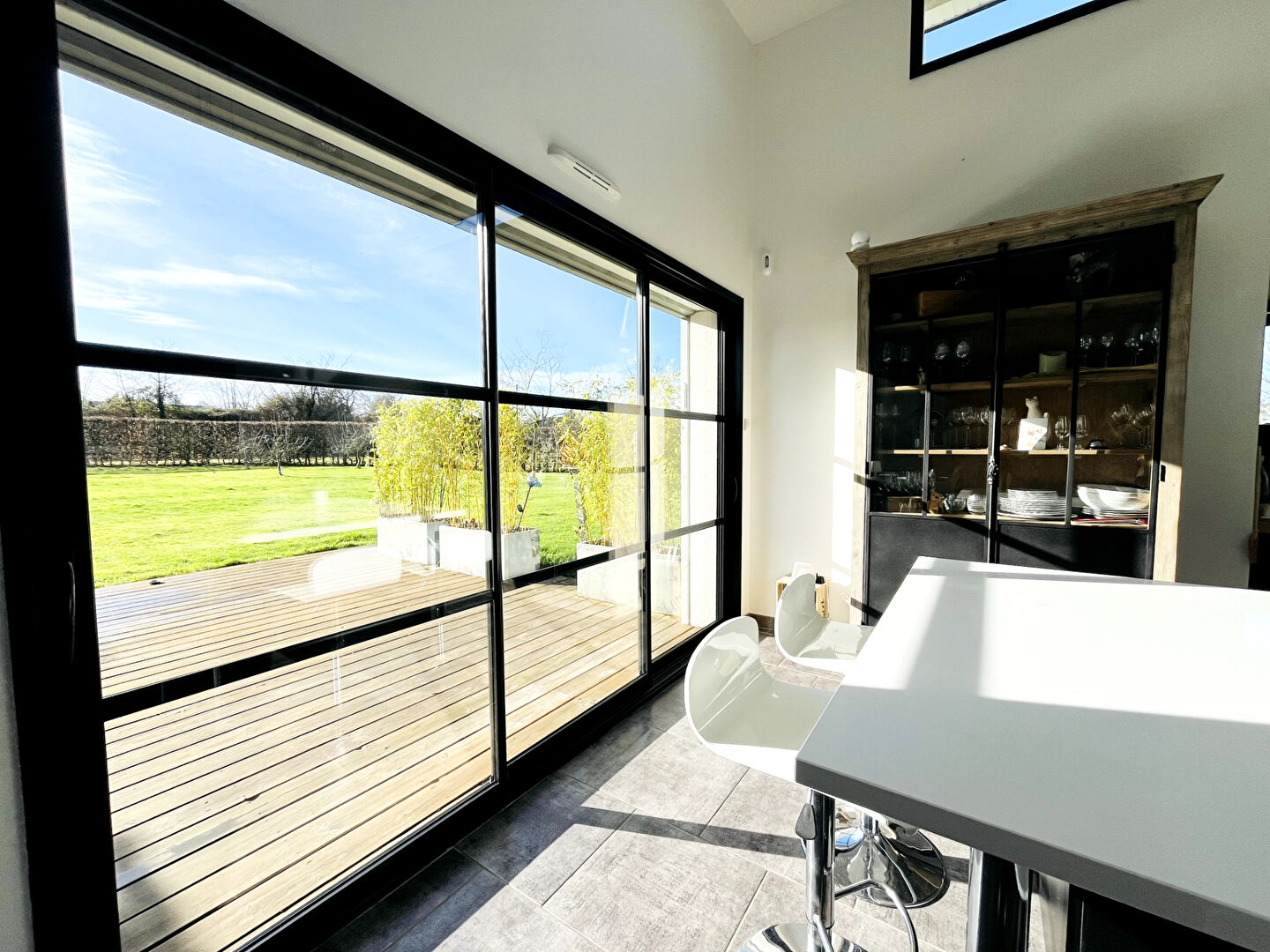 De larges ouvertures donnent d'un côté sur un patio et de l'autre sur une grande terrasse offrant une agréable vue sur le jardin sans aucun vis-à-vis.