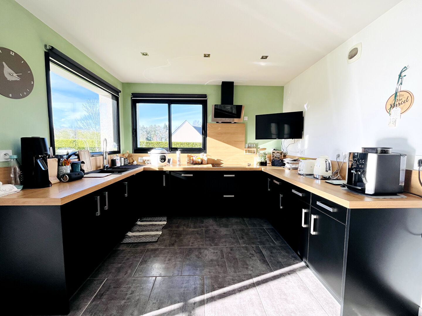 La pièce de vie de presque 80m2 bénéficie d'une exposition traversante et d'une belle hauteur sous plafond et d'une cuisine aménagée et entièrement équipée.